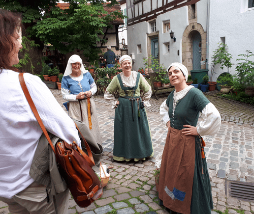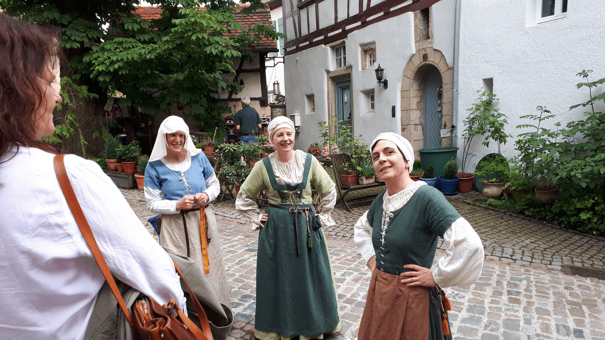 Szenische Erlebnisführung über das Leben im Mittelalter. Mit dem Wimpfener Weybern durch die Gassen der Bad Wimpfener Altstadt. Inkl. HNV-Ticket. Durch Gassen, Gossen und das ganze Himmelreich | Erlebnisführung Erleben Sie das ausgehende Mittelalter unterhaltsam und lebendig gemeinsam mit schwatzhaften Wimpfener Mägden unterwegs in den Gassen der Fachwerkaltstadt. Tauchen Sie ein in vergangene Zeiten - die bunt, schmutzig, gefährlich, fromm und ebenfalls freizügig waren. Sind Sie neugierig, ob ein Huhn das Seelenheil retten kann, ein Henker auch Heilung bringt und warum Kinder besser Bier trinken sollten? Inkludierte Leistungen Szenische Erlebnisführung mit zwei Gästeführerinnen im historischen Gewand inkl. ÖPNV-Ticket für das regionale Streckennetz Weitere Hinweise Dauer ca. 1,5 h Beginn der Führung am Bahnhof Bad Wimpfen max. Teilnehmerzahl 25 Personen Tickets online buchen Ermäßigung mit Gästekarte Bad Rappenau/Bad Wimpfen bwegt-Plus Partner: bei Vorlage eines tagesaktuellen bwtarif-Tickets erhalten Sie eine Vergünstigung Tipp - kostenlose Anreise mit dem ÖPNV Bei Vorausbuchung der öffentlichen Stadtführung ist im Ticket die An- und Abreise mit dem ÖPNV im gesamten Streckennetz des HNV inklusive.