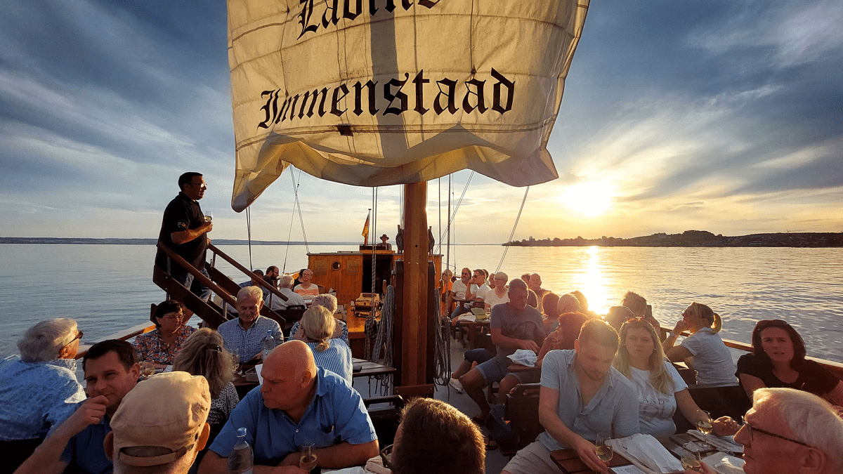 Immer Mittwoch´s heißt es - WEIN AHOI! Sonnenuntergangsfahrt inkl. Weinprobe auf der Lädine mit Weingut FG Wir laden Sie ein auf eine Weinausfahrt mit der Lädine Immenstaad und Weingut FG. An Bord erwarten Sie 4 köstliche FG Weine - "werden auch Sie unverschämt glücklich ", 1 erfrischender Apfel-Cider, Käsewürfel, Oliven & Brot. Martin sorgt mit seinem Alphorn und seiner steirischen Harmonika für Stimmung - ganz romantisch segeln Sie in den Sonnenuntergang!