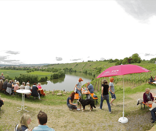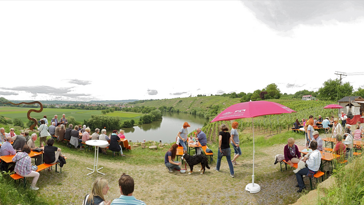 Genießen Sie die herrliche Aussicht auf die Neckarschleife und verkosten Sie Weine der Weingärtner Stromberg-Zabergäu eG direkt in den Weinbergen. Hoch über dem Neckar, eingebettet zwischen Obstplantagen und Weinreben, erwartet dich der Weinausschank an der WeinTerrasse Kirchheim – ein Ort zum Durchatmen und Genießen. Freu dich auf einen herrlichen Blick über die Neckarschleife und die steilen Weinlagen am Kirchheimer Kirchberg. Für das leibliche Wohl sorgen die Kirchheimer Vereine oder Mitglieder der WG Stromberg-Zabergäu – mit einem guten Viertele und einer herzhaften Roten Wurst vom Grill. ### Öffnungszeiten **Bei gutem Wetter sonntags geöffnet** - März - Juli | von 11 - 17 Uhr - September - November | von 11 - 17 Uhr #### Sondertermine: - 01.Mai | Tag der Arbeit - 14.Mai | Himmelfahrt - 25.Mai | Pfingsten - 04.Juni | Fronleichnam - 03.Oktober | Tag der dt. Einheit - 31.Dezember | Silvesterausschank ### Hiermit lässt sich der Ausflug zu der Weinterrasse Kirchheim verbinden: **[Neckartal Radweg](https://www.heilbronnerland.de/radfahren/radwege-radtouren/fernradwege/neckartal-radweg)** Der Neckartal-Radweg führt durch die malerische Kulturlandschaft Baden-Württembergs. Vorbei an Schlössern, Burgen, Wäldern, Wiesen und steilen Weinhängen können Fahrradfahrer ihre Fahrt auf dem zertifizierten 4-Sterne-Radweg genießen. Der Weinausschank liegt oberhalb des Radwegs und ist über eine Treppe zu erreichen.