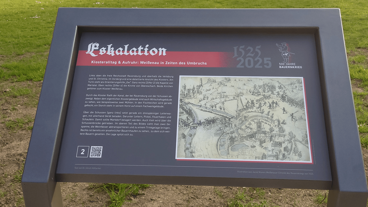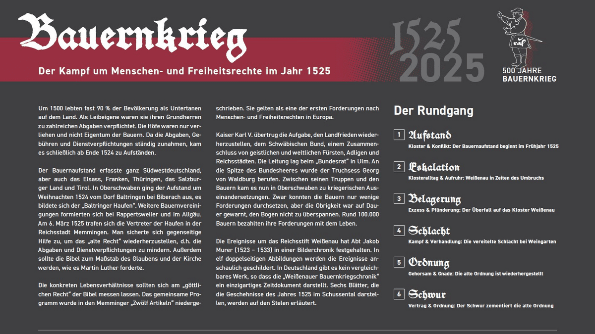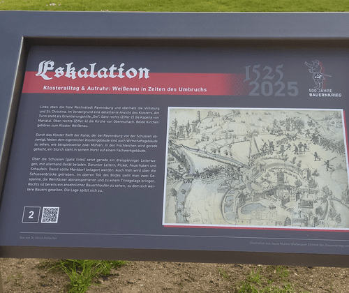 Stelenpark - Ereignisse im Schussental und dem Reichsstift Weißenau während des Bauernkriegs im Jahr 1525. Neuer Stelenpark mit Dauerausstellung, bei dem die Geschehnisse im Schussental und dem Reichsstift Weißenau während des Bauernkriegs im Jahr 1525 anhand einzelner Blätter aus der Weißenauer Chronik erörtert werden.