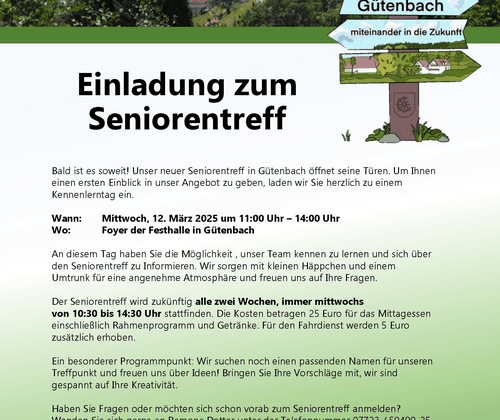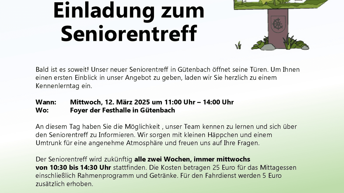 Mittagstisch und geselliges Beisammensein Unser Seniorentreff in Gütenbach mit Mittagstisch und kleinem Rahmenprogramm öffnet alle 2 Wochen, Mittwochs seine Türen. Wir laden Sie recht herzlich ein. Der Seniorentreff findet alle zwei Wochen, immer mittwochs von 10:30 bis 14:30 Uhr statt. Die Kosten betragen 25 Euro für das Mittagessen einschließlich Rahmenprogramm und Getränke. Für den Fahrdienst werden 5 Euro zusätzlich erhoben. Anmeldung ist erforderlich. Bitte wenden Sie sich gerne an Ramona Dotter unter der Telefonnummer 07723 / 50499-25. Wir freuen uns auf Sie! Ihre Sozialstation Oberes Bregtal in Kooperation mit der Gemeinde Gütenbach