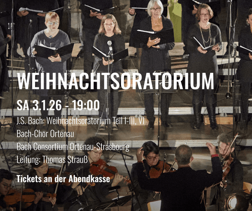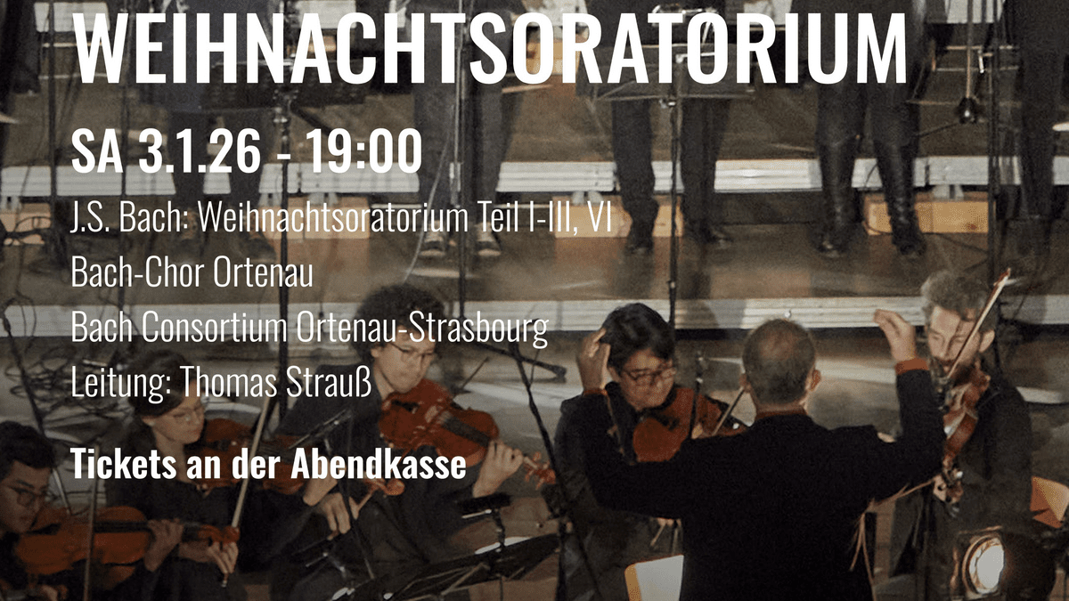 Weihnachtsoratorium Weihnachtsoratorium in der Kath. Kirche St. Anna & St. Bernhard J. S. Bach: Weihnachtsoratorium Teil I-III, VI Bach-Chor Ortenau Bach Consortium Ortenau-Strasbourg Leitung: Thomas Strauß Tickets gibt es an der Abendkasse