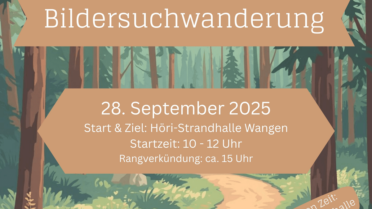 **Auf zur Bildersuchwanderung in Wangen!** ***Ideal für eine Gruppenaktion, für die Familie oder als Duo*** Am **Sonntag 28.09.2025** veranstaltet der TuS Wangen seine traditionelle Bildersuchwanderung. Mitmachen können Familien, begleitete Kindergruppen und Gruppen von mind. 2 Personen. Start- und Endpunkt ist die Höri- Strandhalle. Dort kann man individuell zwischen 10:00 und 12:00 Uhr starten. 15:00 Uhr Rangverkündung. Wer auf Tour geht, erkundet die nahe Umgebung von Wangen auf einer ca. 5-6 km langen Wanderstrecke (kinderwagentauglich) und geht zugleich auf Bildersuche: Auf der Stecke gilt es herauszufinden, wo welche Bilder aufgenommen wurden - ein gutes Auge und detektivisches Geschick sind also gefragt. Außerdem muss man an Stationen unterhaltsame Fragen beantworten und kleine Geschicklichkeitsaufgaben bewältigen. **Neu:** Die Kinder bekommen dieses Jahr ihre eigene „Bildersuchzone“. In dieser Zeit haben die Erwachsenen Pause und können sich auf die Bildersuche der Kinder konzentrieren. Natürlich sorgen wir auch dieses Mal für Ihr leibliches Wohl und bewirten vor der Höri-Strandhalle. Dazu sind alle recht herzlich eingeladen – nicht nur die Aktiven, sondern die gesamte Bevölkerung. Auf Ihre Teilnahme oder Besuch freuen wir uns!