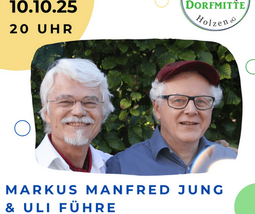 Markus Manfred Jung & Uli Führe - E himmlischi Unterhaltig Alemannische Lieder, Geschichten und Gedichte von und mit Uli Führe und Markus Manfred Jung Freitag: 10. Oktober 2025, 20 Uhr Uli Führe und Markus Manfred Jung sind, seit sie 1976 beide einen 1. Preis im Wettbewerb "Junge Mundart" gewonnen hatten, nicht mehr aus der alemannischen Szene wegzudenken. Führe hat sich als Liedermacher einen ausgezeichneten Ruf erworben. Unter anderem erhielt er den Kleinkunstpreis Baden-Württembergs. Er lebt als Komponist, Sänger, Stimmbildner und Musiker in Buchenbach-Unteribental. Jungs Mund-Art Lyrik wurde inzwischen mit zahlreichen, auch internationalen Preisen bedacht, u.a. in Italien und Rumänien. Seine Gedichte sind in mehrere Sprachen übersetzt. Er ist Schriftsteller und lebt mit der Malerin Bettina Bohn im Kleinen Wiesental. Die CD "IKARUS", auf der Führe die Lyrik von Jung neuartig und spannend vertont und eingespielt hat, erhielt sensationell den "Jahrespreis der deutschen Schallplattenkritik". „fedreliicht“ heißt die letzte gemeinsame CD-Produktion.