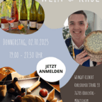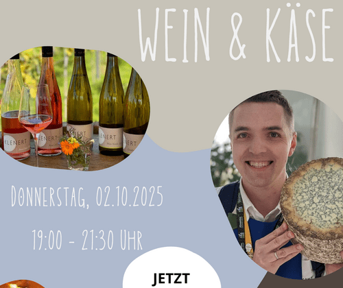 Datum: Donnerstag, 02.10.2025 Start: 19:00 bis 21:30 Uhr 59,00€ pro Person 7 Käsesorten aus 7 Ländern, Secco-Rosé, 1 Black Label Premium Wein, 4 Weine aus der Standardweingutslinie Euch erwarten spannende Entdeckungen – von den „Käseblumen“ aus der Schweiz bis zum „Schokoladenkäse“ aus Norwegen. Wir sprechen über die Traditionen der Käseherstellung und erfahren, welche Sorten als kulinarische Visitenkarte der jeweiligen Länder gelten. Lasst euch überraschen und lernt die perfekte Harmonie der unterschiedlichen Käsesorten mit den genussvollen Weinen vom Weingut Klenert kennen. Moderatoren: Aleksandr Krupetskov – professioneller Käsesommelier mit über 10 Jahren Erfahrung in der Käsewelt und Manfred Beismann – beschäftigt sich seit über 25 Jahren intensiv mit dem Thema Wein Wein & Käse Datum: Donnerstag, 02.10.2025 Start: 19:00 bis 21:30 Uhr 59,00€ pro Person 7 Käsesorten aus 7 Ländern, Secco-Rosé, 1 Black Label Premium Wein, 4 Weine aus der Standardweingutslinie Euch erwarten spannende Entdeckungen – von den „Käseblumen“ aus der Schweiz bis zum „Schokoladenkäse“ aus Norwegen. Wir sprechen über die Traditionen der Käseherstellung und erfahren, welche Sorten als kulinarische Visitenkarte der jeweiligen Länder gelten. Lasst euch überraschen und lernt die perfekte Harmonie der unterschiedlichen Käsesorten mit den genussvollen Weinen vom Weingut Klenert kennen. Im Preis enthalten: Eine individuelle Käseplatte mit den 7 unterschiedliche SortenSorgfältig ausgewählte WeineEine Verkostungstabelle und Geschmackskarte, damit ihr Käse wie Profis degustieren könnt Moderatoren: Aleksandr Krupetskov – professioneller Käsesommelier mit über 10 Jahren Erfahrung in der Käsewelt und Manfred Beismann – beschäftigt sich seit 25 Jahren intensiv mit dem Thema Wein Zum Wohle der Umwelt verzichten wir auf separate Tickets. Bitte nennen Sie am Abend der Veranstaltung unserem Begrüßungsteam Ihren Namen und genießen Sie anschließend die Weinprobe und 7 ausgewählte Käsesorten Parkplätze finden Sie hinter dem Gebäude.