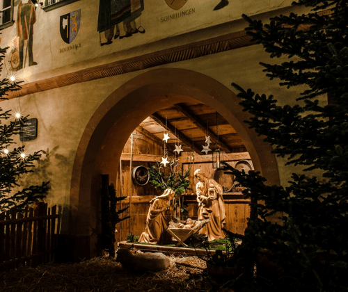 Großer Anziehungspunkt, besonders für Familien, ist in den Adventswochen und bis nach Dreikönig die Haslacher Großkrippe unter den Rathausarkaden mit lebendigen Tieren. Da blöken die Schafe, meckert die Ziege und der Esel beobachtet in aller Seelenruhe die am Zaun stehenden Kinder und Besucher der Haslacher Altstadt. Der Haslacher Handels- und Gewerbeverein tut sein Übriges dazu und stellt in 24 Schaufenstern der Geschäfte die verschiedensten Kleinkrippen auf. Gewinnspiel: Kinder können sich bei einem Gewinnspiel beteiligen. Wer sämtliche 24 Namen der Schaufensterkrippen auf dem Teilnahmezettel einträgt hat Chance auf einen der Geschenkgutscheine im Wert von jeweils 50 Euro.