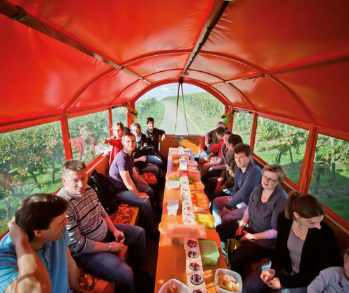 Wein-Wagen-Geschichte(n) erleben und er-Fahren bei einer Planwagenfahrt mit Erläuterungen zu Weinbau, Stadtgeschichte sowie Weinprobe. 47 € pro Person. Bei der Fahrt mit unseren orangen Planwagen "Katzenbeisser-Carrus" sprechen wir alle 5 Sinne an. Sie schmecken, riechen, genießen unsere ausgewählten Weine und Sie lauschen unseren vielschichtigen Erläuterungen , die wir Ihnen an verschiedenen besonderen Stellen in Lauffen zeigen werden. Und wie und was man bei unserer "Fünf-Sinne-Tour" fühlen kann - lassen Sie sich überraschen - herzliche Einladung dieser besonderen Wein-Erlebnis-Fahrt. Der "Katzenbeisser Carrus" bietet Platz für bis zu 25 Gäste, das kleinere "Cärrele" für zusätzlich bis zu 15 Gäste. Die beheizbaren Wagen werden von Traktoren gezogen und ermöglichen eine witterungsunabhängige Fahrt mit Panoramablick. Zwei Einstiege über Treppen, großzügige Beinfreiheit und bequeme Sitzmöglichkeiten bieten hohen Komfort während der Fahrt. Ein rollstuhlgerechter Platz ist vorhanden. ### inkludierte Leistungen - - Begleitung durch zertifizierte Weinerlebnisführerin - 5 er Weinprobe, Mineralwasser und Traubensaft - regionales Fingerfood : Käse, Wurst, Bauernbrot, uvm. - Kosten: 47 €/Person ### Veranstalter, weitere Informationen & Anmeldung: Weingärtnerfamilie Gotthart und Martina Buck (Weinerlebnisführerin) In den Herrenäckern 18 74348 Lauffen am Neckar Telefon [07133 5117](tel:071335117) [katzenbeisser-carrus@gmx.de](mailto:katzenbeisser-carrus@gmx.de) Diese Tour ist ein Angebot der Weinerlebnisführer Baden-Württemberg in der Reihe ""WeinWochenenden Baden-Württemberg" - jedes Wochenende von Freitag bis Sonntag mehrere Termine. Weitere Termine für Einzelpersonen und Kleingruppen unter [www.HeilbronnerLand.de/Weinerlebnistour](https://www.heilbronnerland.de/wein/weinerlebnisse/weinerlebnistouren)