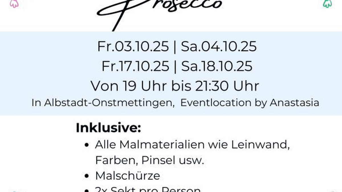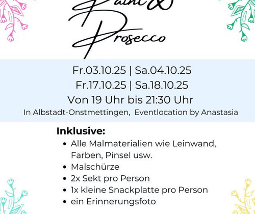 Erlebe einen Abend voller Farben, guter Musik und prickelndem Prosecco. Bei 'Paint & Prosecco' erschaffen  die Teilnehmer in lockerer Atmosphäre, unter Anleitung ihr eigenes Kunstwerk auf Leinwand, begleitet von Musik und kleinen Häppchen.  Ideal für Freundesgruppen, Geburtstage, After-Work-Events oder Junggesellenabschiede. Inklusive: Alle Malmaterialien wie Leinwand, Farben, Pinsel usw. Malschürze 2x Sekt pro Person 1x kleine Snackplatte pro Person ein Erinnerungsfoto