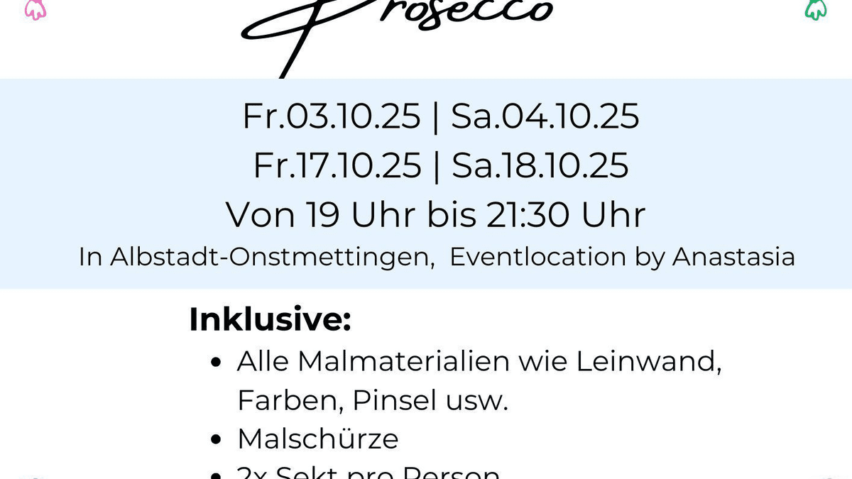 Erlebe einen Abend voller Farben, guter Musik und prickelndem Prosecco. Bei **'Paint & Prosecco'** erschaffen  die Teilnehmer in lockerer Atmosphäre, unter Anleitung ihr eigenes Kunstwerk auf Leinwand, begleitet von Musik und kleinen Häppchen.  Ideal für Freundesgruppen, Geburtstage, After-Work-Events oder Junggesellenabschiede. Inklusive: - Alle Malmaterialien wie Leinwand, Farben, Pinsel usw. - Malschürze - 2x Sekt pro Person - 1x kleine Snackplatte pro Person - ein Erinnerungsfoto