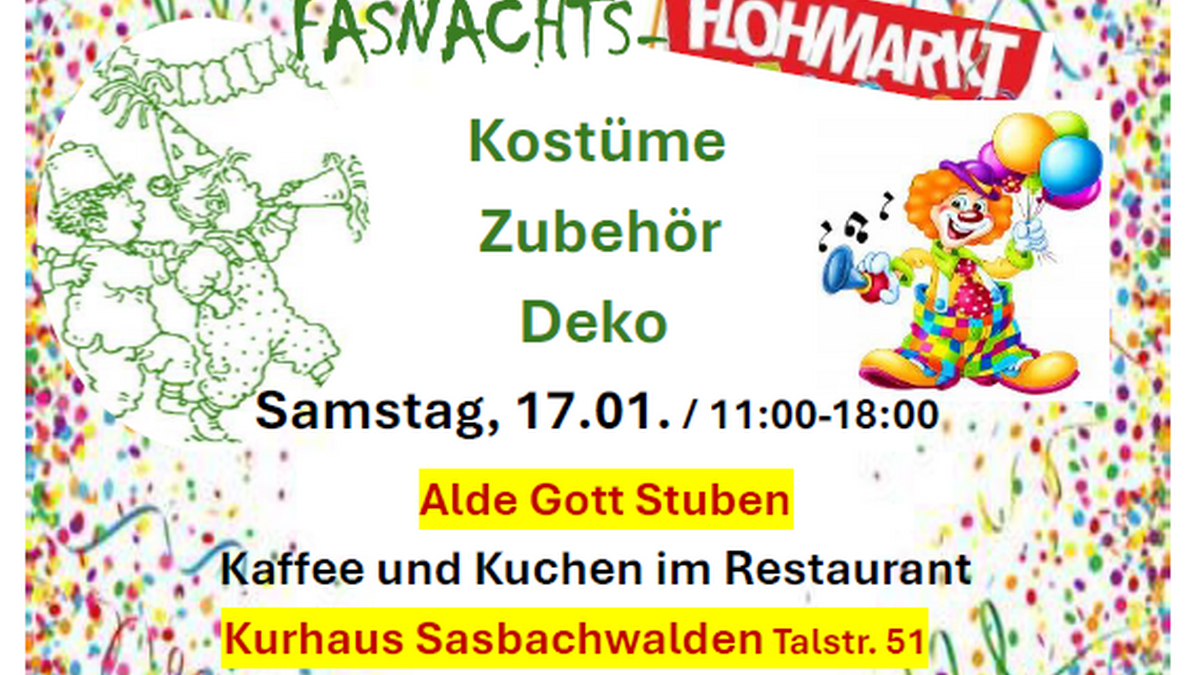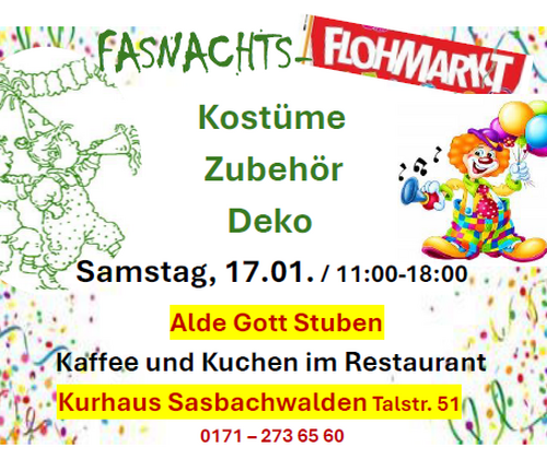 Fasnachtsflohmarkt in der Alde Gott Stuben im Kurhaus Sasbachwalden Kostüme, Accessoires und Deko. Im Restaurant gibt es Kaffee und Kuchen.