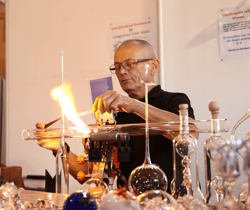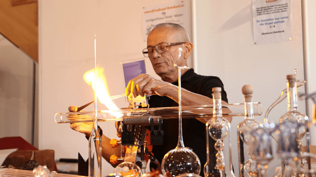 Schau dem Glasbläser Reinhard Börner bei seiner Arbeit über die Schulter. Aus Glasröhren entstehen durch Hitze, Blasen und Ziehen kleine Kunstwerke. Du kannst sogar deine eigene Glaskugel gestalten! Bei der Glasbläservorführung mit Reinhard Börner kannst du live erleben, wie aus einfachen Glasstäben und -röhren echte Kunstwerke entstehen. Mit viel Fingerspitzengefühl formt er kleine Gefäße, Dekorationen und Glaskugeln – alles direkt über der Flamme. Du erfährst, wie durch Drehen, Blasen und Ziehen die Formen entstehen und bekommst spannende Einblicke in ein altes Handwerk. Wenn du magst, kannst du gegen einen kleinen Unkostenbeitrag sogar selbst eine Glaskugel gestalten. Einfach vorbeikommen, zuschauen und mitmachen!