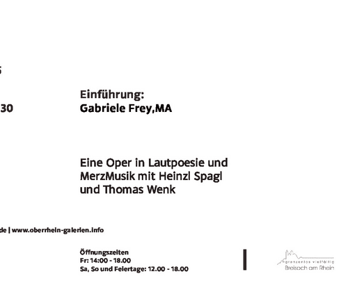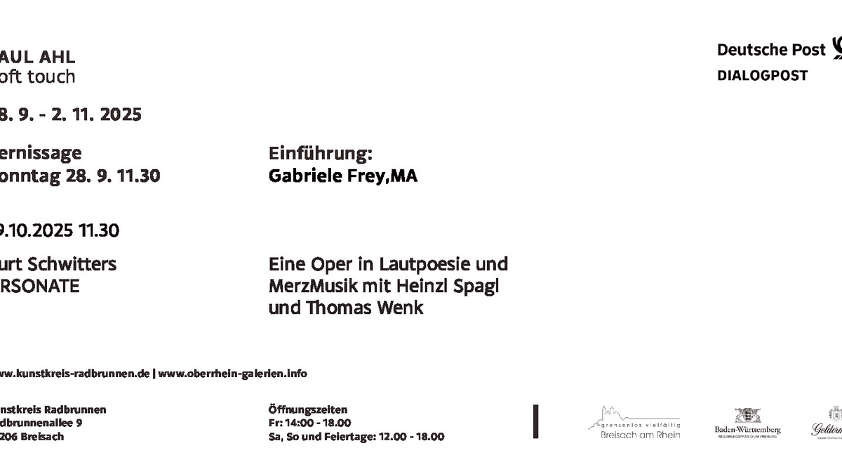 Kunstkreis Radbrunnen Breisach PAUL AHL Soft Touch 28.09. - 02.11.2025 Paul Ahl Soft touch 28.9.- 2.11.2025 Vernissage: So 28.9.2025 11:30Uhr Einführung: Gabriele Frey,MA 19.10.2025 11:30Uhr Kurt Schwitters URSONATE Eine Oper in Lautpoesie und MerzMusik mit Heinzl Spagl und Thomas Wenk Kunstkreis Radbrunnen Breisach Radbrunnenallee 9 Öffnungszeiten: Fr 14-18 , Sa ,So und Feiertage 12-18 Uhr