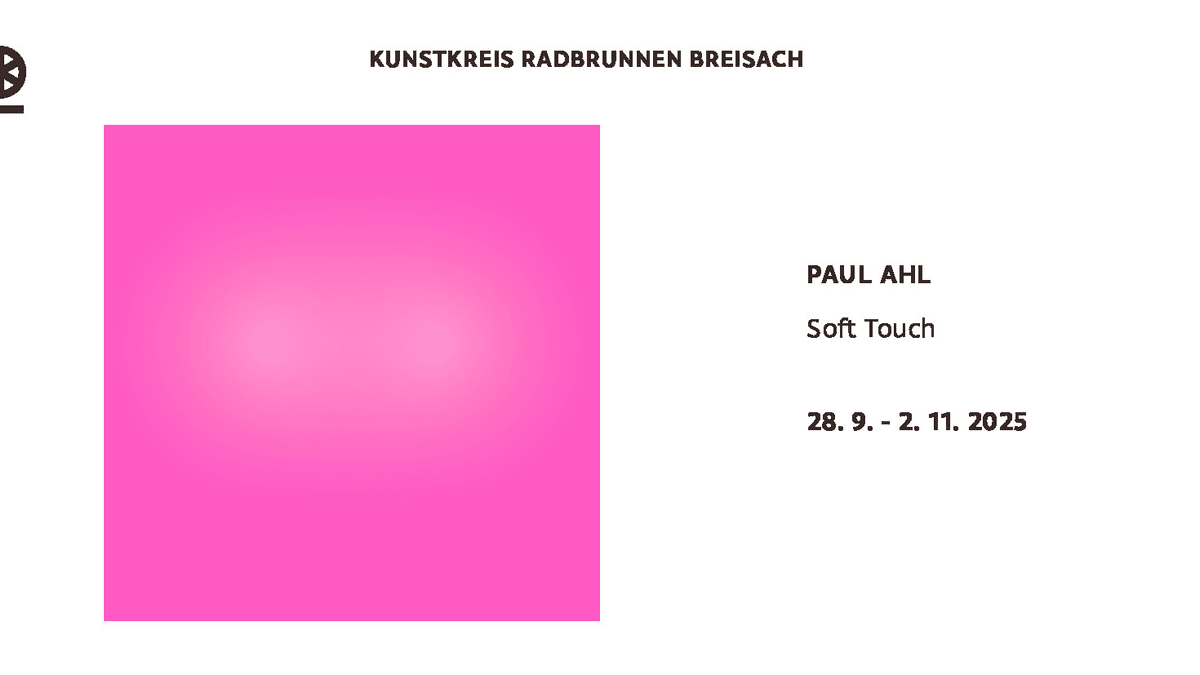 **Kunstkreis Radbrunnen Breisach PAUL AHL** Soft Touch **28.09. - 02.11.2025** **Paul Ahl** Soft touch **28.9.- 2.11.2025** **Vernissage: So 28.9.2025 11:30Uhr ** **Einführung: Gabriele Frey,MA** **19.10.2025 11:30Uhr** Kurt Schwitters URSONATE Eine Oper in Lautpoesie und MerzMusik mit Heinzl Spagl und Thomas Wenk **Kunstkreis Radbrunnen Breisach Radbrunnenallee 9** **Öffnungszeiten: Fr 14-18 , Sa ,So und Feiertage 12-18 Uhr**