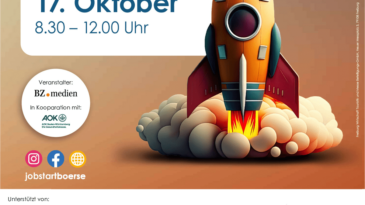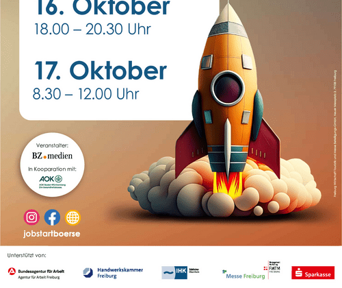 Job-Start-Börse In der Breisgau-Halle in Breisach am Rhein  Am 16. Oktober von 18:00-20:30 Uhr Am 17. Oktober von 08:30-12:30 Uhr  Veranstalter: BZ Medien  Eine Initiative für Ausbildungs- und duale Studienplätze Job-Start-Börse In der Breisgau-Halle in Breisach am Rhein Am 16. Oktober von 18:00-20:30 Uhr Am 17. Oktober von 08:30-12:30 Uhr Veranstalter: BZ Medien ww.jobstartboerse.de Eine Initiative für Ausbildungs- und duale Studienplätze Bei uns: - gibt es Berufe zum Anfassen - gibt es alles Wissenswerte rund um Schule, Aus- und Weiterbildung  - berichten Auszubildende und Experten aus der Praxis