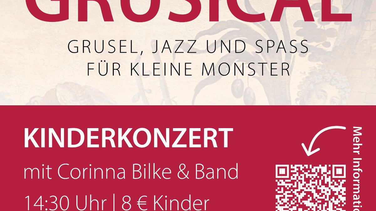 Grusel, Jazz und Spaß für kleine Monster ab 4 Jahren! Erlebt ein schaurig-schönes Kinderkonzert, bei dem die Musik jazzt und das Bühnenbild verzaubert. Unser Kinderkonzert im Josephsaal ist der perfekte Auftakt für eine schaurig-schöne Zeit. Die Münsteraner Liedermacherin und Sängerin Corinna Bilke schreibt Jazz- und Popmusik für Familien. Statt der üblichen Klischees traditioneller Kinderlieder bringen sie und ihre Band jazzige Harmonien aus Piano, Bass und Schlagzeug mit. Ihr musikalisches Programm versprüht Freude und zaubert eine wunderbar wohlige Atmosphäre, egal ob unter dem Meer, im Weltall oder im Spukschloss. In ein solches Gemäuer voller Spuk, geht es beim „Das Grusical“.  Corinna Bilke führt ihr Publikum in ein verfluchtes Schloss. Dort trifft Mira, ein Mädchen aus einem kleinen Dorf, auf die stets schlecht gelaunte Hausherrin Miss Mary, mit der etwas nicht stimmt … Aber was? Schaurig-schöne Songs, witzige Dialoge und Corinna Bilkes unverwechselbare Art laden Groß und Klein zum Mitsingen, Tanzen, Träumen und natürlich zum Gruseln ein.