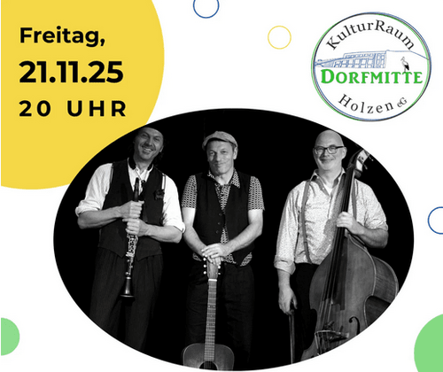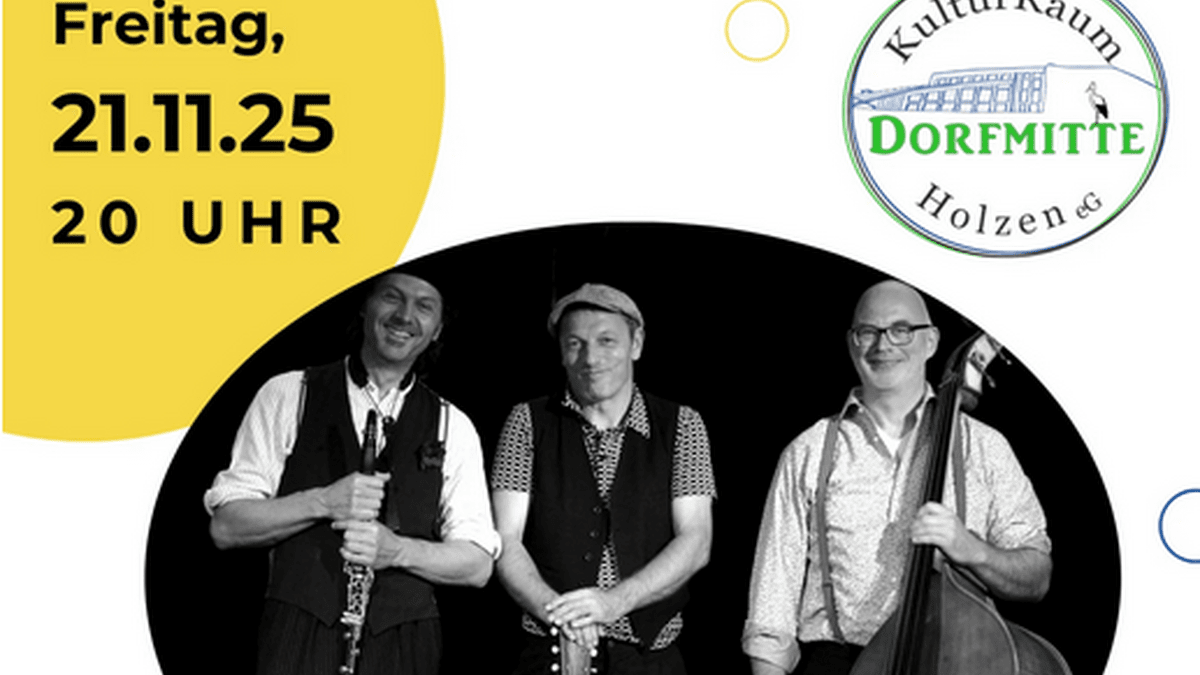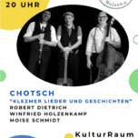 Chotsch- Klezmer Lieder und Geschichten Freitag: 21. November 2025, 20 Uhr Das Trio Chotsch kommt aus Freiburg und spielt in der Besetzung: Klarinette Robert Dietrich Kontrabass Winfried Holzenkamp und Gitarre, Gesang, Erzählung Moise Schmidt . Angefangen hat alles mit der Liebe zur Klezmer Musik. Klezmer ist die Musik der Juden Osteuropas, vorwiegend Tänze voller Energie und Lebensfreude, die traditionell auf Festen gespielt wurde. Diese Musik verbindet Chotsch experimentierfreudig mit modernen musikalischen Elementen. So geben sie dem Klezmer ihre eigene musikalische Handschrift, ohne ihm die Seele zu nehmen. Denn die Drei sind leidenschaftliche Musiker und Ihre Spielfreude ist ansteckend. Moise Schmidt ist aber auch ein begnadeter Schauspieler und Erzähler. Er schlüpft in die kauzigen Figuren und erzählt gekonnt und quick lebendig. Und auch Kontrabass, Klarinette und Gitarre tragen jeweils Ihren Teil zur Geschichte bei. Die Musik und die humorvollen Erzählungen verschmelzen wie aus einem Guss. Beste Unterhaltung für Herz und Hirn! Mit Ihrer hinreißenden Mischung aus Musik und Geschichten hat Chotsch über die Jahre nicht nur Klezmer Fans für sich gewonnen, sondern ein Publikum weit darüber hinaus.