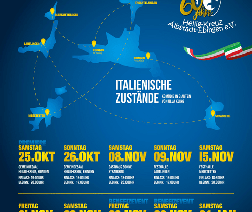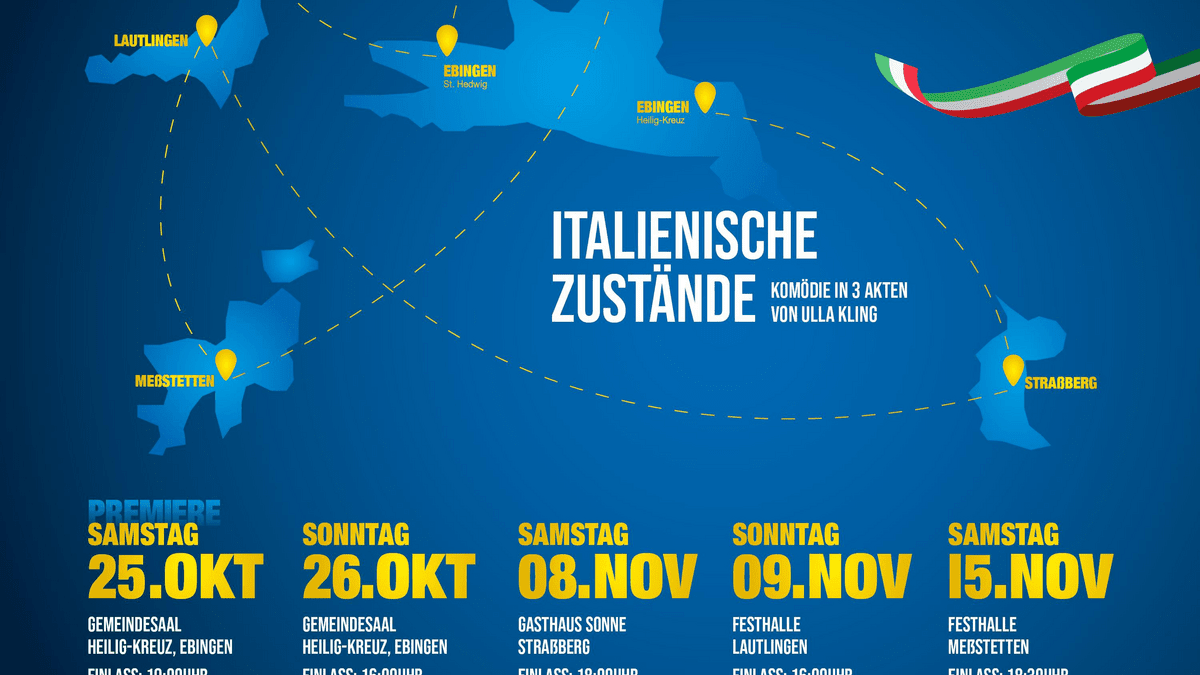 Mit dem Stück "Italienische Zustände" von Ulla Kling geht der Theaterverein wieder auf Tournee in und um Albstadt. Zum 60jährigen Jubiläum bringt der Verein das Stück, das bereits im Jahr 2013 gespielt wurde nochmals auf die Bühne. Die Zuschauer des Theatervereines konnten vergangene Saison zwischen drei Stücken abstimmen, und die Italienischen Zustände haben gewonnen. Mit neuen und alten Hasen auf der Bühne wird diese Jubiläumssaison etwas besonderes, Ihr dürft gespannt sein. Wir freuen uns auf viele Zuschauer. Bei den verschiedenen Spielorten ist für das leibliche Wohl bestens gesorgt.