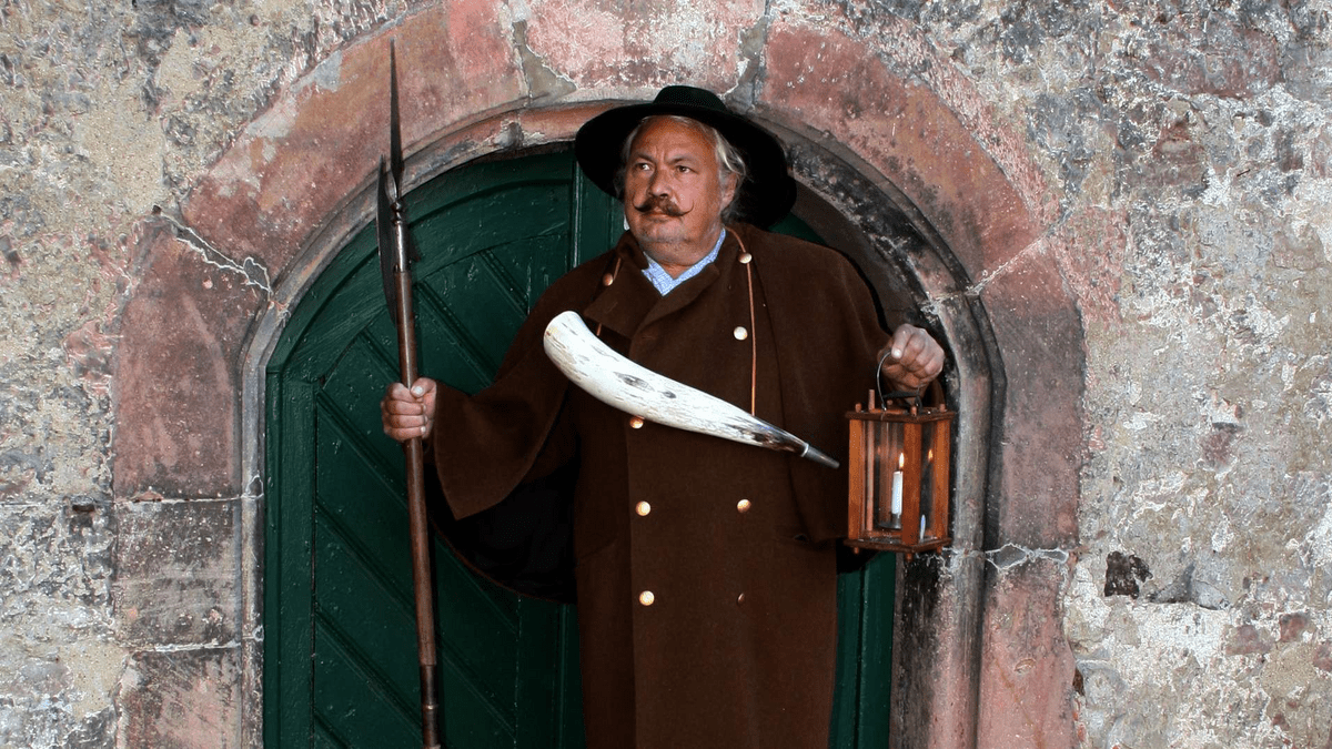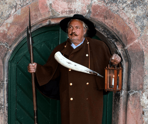 „Hört ihr Leut‘ und lasst Euch sagen, die Glock am Turm hat Zehn geschlagen …“ Wenn es dunkel wird, dreht der Nachtwächter seine Runden ums herrschaftliche Schloss und sagt zu jeder vollen Stunde die Zeit an. Während sich die Bürger zur Nachtruhe begeben, sieht er - ausgerüstet mit Horn, Laterne und Hellebarde - nach dem Rechten, denn im ausgehenden Mittelalter nutzt so manch finstere Gestalt die Nacht zur Tarnung. Begleiten Sie den Nachtwächter auf seiner Tour und lauschen Sie interessanten und amüsanten Geschichten.