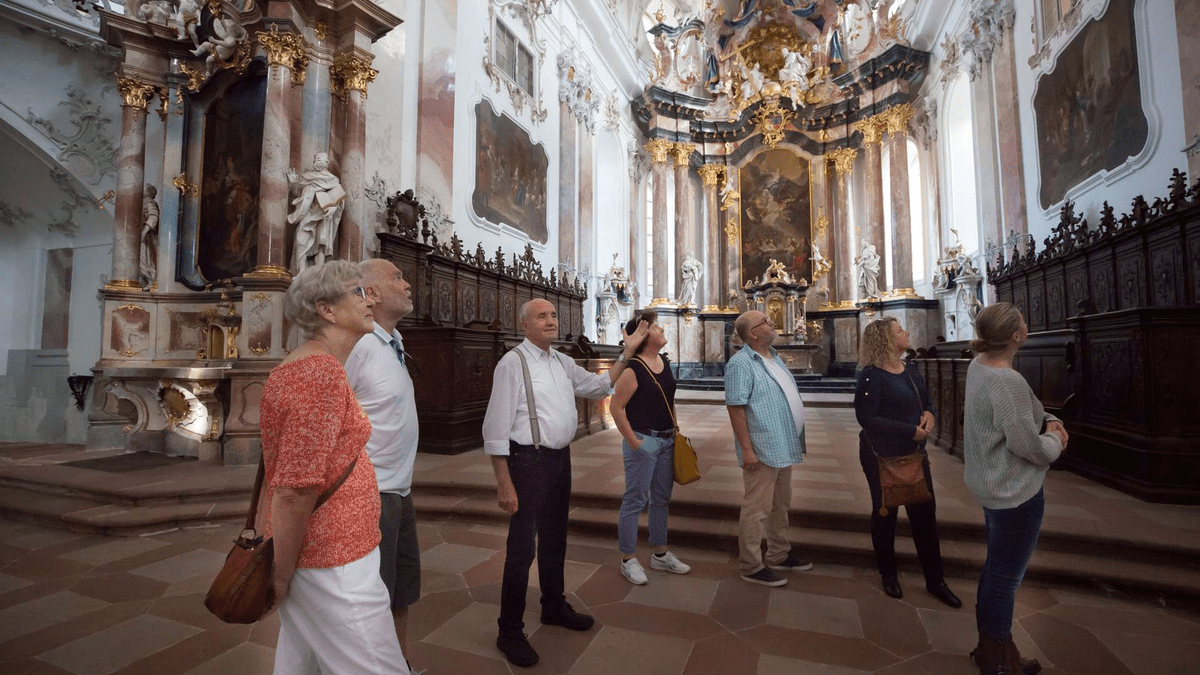 DIE STATIONEN DES RUNDGANGS Abteikirche und Rokoko-Pracht: Die Besichtigung führt in den lichtdurchfluteten Sakralbau von Maximilian von Welsch. Zu sehen sind die originalen Deckenfresken von Matthäus Günther sowie die prunkvolle Kanzel und das schmiedeeiserne Chorgitter, das einst Mönchschor und Laienkirche trennte. Ein technisches Highlight ist die Stumm-Orgel von 1782, deren über 5.000 Pfeifen sie zu einem der klanggewaltigsten Instrumente ihrer Epoche machen. Grüner Saal: Der Festsaal dokumentiert den stilistischen Wandel zum Frühklassizismus. Die feine Ornamentik und die harmonische Raumgestaltung machen ihn zu einem der bedeutendsten Räume dieser Übergangszeit. Klosterbibliothek: Der spätbarocke Saal von 1790 bietet einen Einblick in die Gelehrsamkeit am Ende der Klosterzeit. Mit seinen wandfesten Regalanlagen, die heute die Büchersammlung des Fürstenhauses zu Leiningen beherbergen, ist er in seiner architektonischen Einheit nahezu unverändert erhalten. HINTERGRUND UND ERHALT Die Anlage, die seit 1803 im Besitz des Fürstenhauses zu Leiningen ist, wird als nationales Kulturdenkmal bewahrt. Die Führung thematisiert sowohl die glanzvolle Zeit der Reichsabtei als auch die bis heute fortgeführte Tradition der fürstlichen Pflege. ORGANISATORISCHE HINWEISE Exklusiver Zugang: Während die Abteikirche meist individuell zugänglich ist, können der Grüne Saal und die Bibliothek ausschließlich im Rahmen dieser geführten Tour besichtigt werden. Hinweis: Aufgrund kirchlicher Termine sind kurzfristige Programmanpassungen möglich.