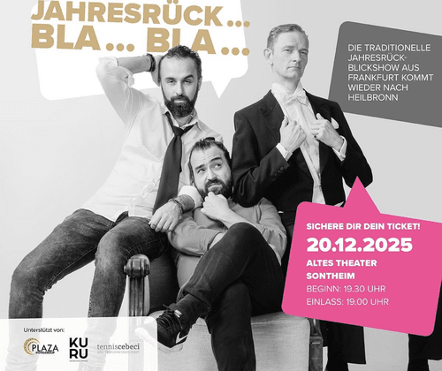 DEUTSCHLANDPREMIERE WENN DER WAHNSINN ALLTAG WIRD, HILFT NUR NOCH KABARETT MIT AYDIN ISIK, MIKE McALPINE, UND KADIR ZEYREK! Ein Abend voller Witz, Humor, Ironie & Frechheit. Ein Abend mit bester Unterhaltung. Der Jahresausklang ist die Zeit der Reflexion – und was hilft besser gegen den Irrsinn des Alltags als Humor? Bis Silvester ist noch einige Zeit, doch die drei „Experten“ beobachten, analysieren und sezieren schon jetzt das aktuelle Geschehen – mit Haltung, Humor und einer ordentlichen Portion Frechheit. Politik, Gesellschaft, Weltgeschehen: nichts bleibt unkommentiert. Lassen Sie sich überraschen! Dabei beschränken sich die drei preisgekrönten Künstler nicht nur mit den tagespolitischen Absurditäten. Sie nehmen das große Ganze ins Visier, legen den Finger in die Wunde – und schaffen es trotzdem, ihre Gäste zum Lachen zu bringen. Jahr für Jahr, getreu dem Motto: Lacht mit, bevor wir`s wieder ernst nehmen müssen! Manche Rückblicke machen sprachlos. Dieser macht sprachgewandt und ziemlich laut. Nach dem Erfolg im letzten Jahr kehren die drei Ausnahmekünstler Mike, Kadir und Aydın mit Ihrer pointierten Jahresrückblick-Show auf die Bühne und auch wieder nach Heilbronn zurück. Erleben Sie einen Abend voller Witz, feiner Ironie und bester Unterhaltung. Lassen Sie das Jahr 2025 bei der Show „JAHRESRÜCK ... BLA ... BLA … 2025“ in Sontheim „Altes Theater Heilbronn“ Revue passieren. BEREIT FÜR EINEN ABEND ZUM LACHEN, STAUNEN UND MITDENKEN?