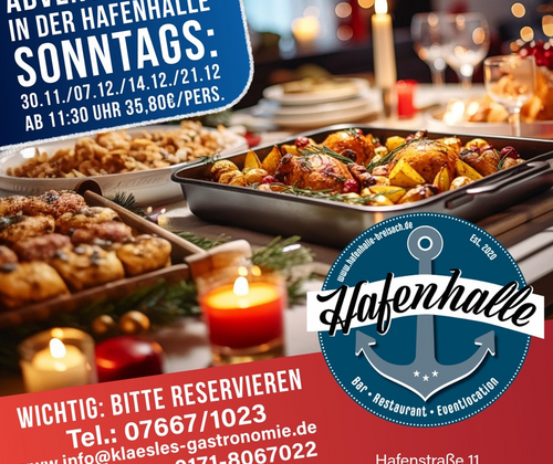 Adventsbuffet Adventsbuffet am Sonntag in der Hafenhalle Sonntags: 30.11., 07.12., 14.12., 21.12.2025 jeweils ab 11:30 Ab 11:30 Uhr 35,80 € pro Person BITTE RESERVIEREN 07667-1023 info@klaesles-gastronomie.de Whats-App: 0171-8067022