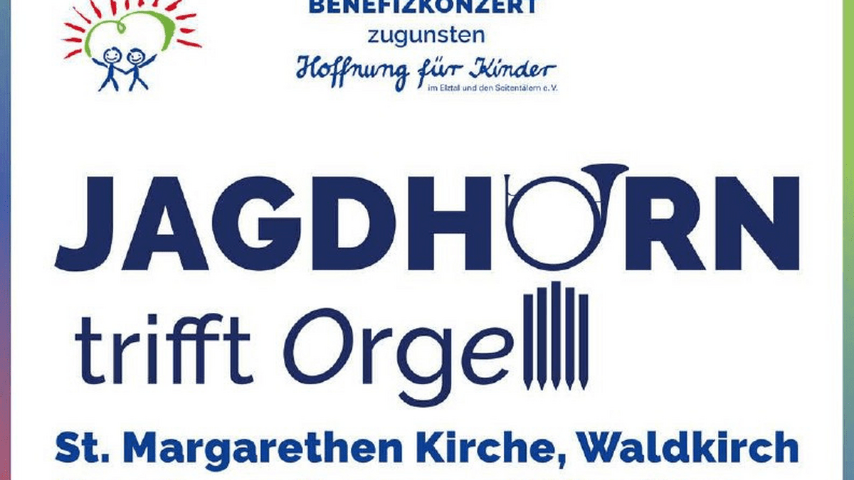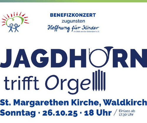 Am Sonntag, den 26.10.2025, findet um 18.00 Uhr ein Benefizkonzert unter dem Motto „Jagdhorn trifft Orgel“ in der St. Margarethen Kirche in Waldkirch statt. Alle Einnahmen an diesem Abend werden an Hoffnung für Kinder im Elztal und den Seitentälern gespendet Die Jagdhornbläsergruppen Markgräflerland und Kaiserstuhl geben zusammen mit der Organistin Eva Wohlfarth ein Benefizkonzert zugunsten des Vereins "Hoffnung für Kinder im Elztal und den Seitentälern e.V.“. Die Jagdhornbläsergruppe Markgräflerland sind als Teil der Jägervereinigung Markgräflerland das musikalische Aushängeschild der Jäger in der Öffentlichkeit. Durch die vielen kameradschaftlichen Beziehungen zwischen den Bläsergruppen wurde zu diesem Konzert auch die Jagdhornbläsergruppe Kaiserstuhl eingeladen. Die Jagdhornbläsergruppe Kaiserstuhl umfasst zurzeit 12 Fürst-Pless-Horn Bläser, 4 davon spielen auch Parforcehörner und werden an diesem Konzertabend stimmungsvolle jagdliche Stücke präsentieren. Unterstützt wird das Konzert zudem an der Orgel von Eva Wohlfahrt. Das Horn zusammen mit der Orgel ist nochmal ein zusätzliches, ergreifendes Klangerlebnis, was beim Publikum für viel Begeisterung sorgt. Mit diesem Konzert werden die Bläsergruppen Spenden für den Verein Hoffnung für Kinder im Elztal und den Seitentälern e.V. sammeln. Der Verein Hoffnung für Kinder im Elztal und den Seitentälern e. V. setzt sich tatkräftig mit Herz dafür ein, dass der Nachwuchs gut in diesem Land aufwachsen kann – was nicht immer einfach ist. Er entscheidet, was bezuschusst bzw. unterstützt werden soll und sorgt dafür, dass die Hilfe unbürokratisch dort ankommt, wo sie dringend benötigt wird. Nach dem Konzert lädt der Verein Hoffnung für Kinder zu einem gemeinsamen Umtrunk auf dem Kirchplatz ein. Auch diese Einnahmen werden für das Wohl der Kinder im Elztal und den Seitentälern eingesetzt. Weitere Informationen unter www.hoffnung-fuer-kinder-im-elztal.de