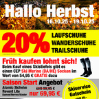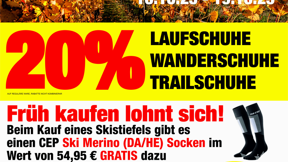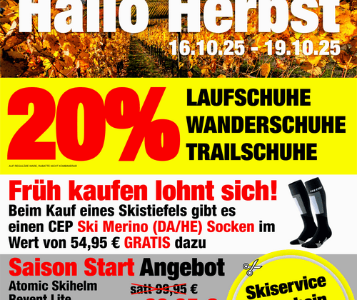 Hallo Herbst Sale mit 20% Rabatt auf alle Lauf-, Trail- und Wanderschuhe sowie weiteren Angeboten - inkl. Verkaufsoffener Sonntag am 19.10. Bei Sport Schwab gibt es vom 16.10.25 - 19.10.25 (inkl. Verkaufsoffener Sonntag) eine "Hallo Herbst"-Aktion.  Nutze die Gelegenheit und spare 20% auf alle Laufschuhe, Wanderschuhe und Trailschuhe. Außerdem leuten wir den Beginn der Wintersport Saison ein. Beim Kauf eines Skistiefels schenken wir dir einen CEP Ski Thermo Socken GRATIS dazu. Mit unserem Skihelm Angebot bist du auf der Piste bestens geschützt. Unseren Skiservice bekommst du mit dem beiligenden Gutschein bis zum 31.10.25 für günstige 25€ anstatt 35€. Verkaufsoffener Sonntag am 19.10.25 von 12-17 Uhr - wir öffnen unsere Hüttenbar, damit du deinen Einkauf gemütlich ausklingen lassen kannst.