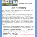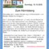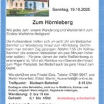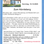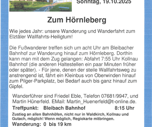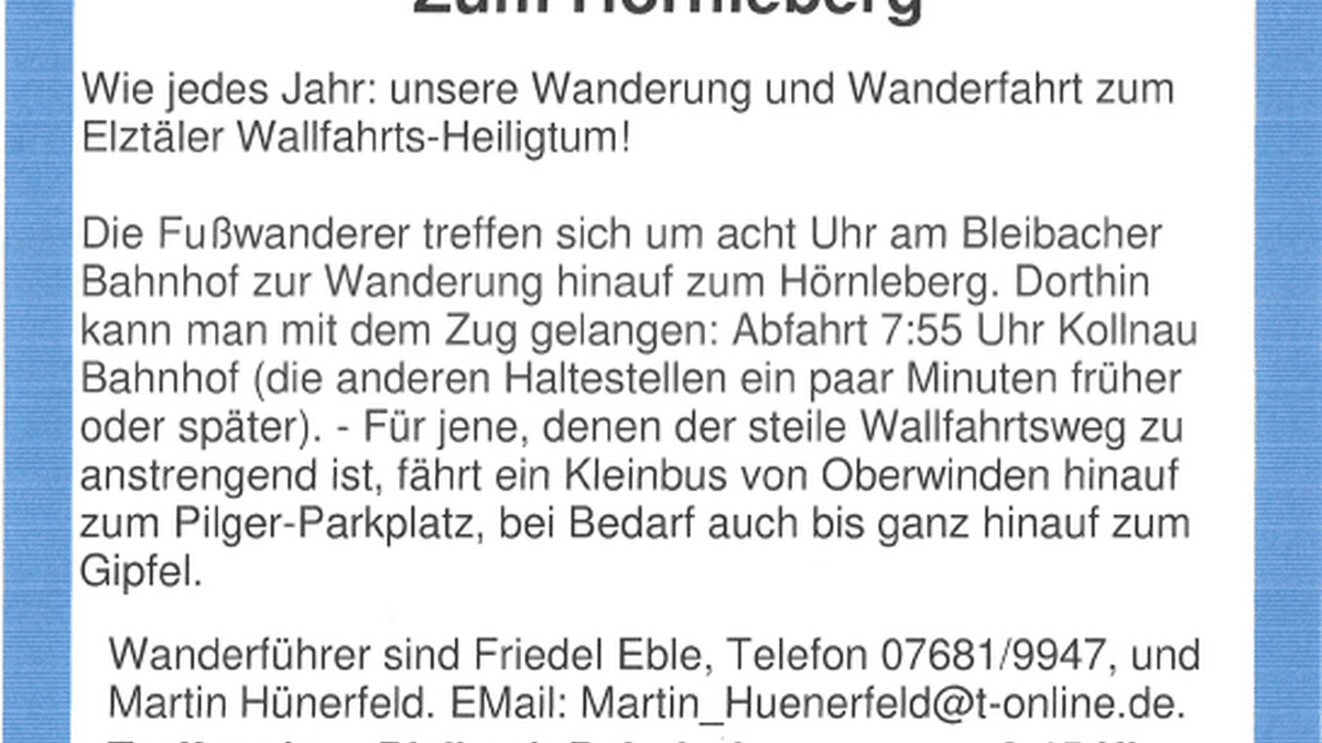 Zum Hörnleberg. Wie jedes Jahr: unsere Wanderung und Wanderfahrt zum Elztäler Wallfahrts-Heiligtum! Die Fußwanderer treffen sich um 8:00 Uhr am Bleibacher Bahnhof zur Wanderung hinauf zum Hörnleberg. Dorthin kann man auch mit dem Zug gelangen: Abfahrt 7:55 Uhr Kollnau Bahnhof (die anderen Haltestellen ein paar Minuten früher oder später). Für jene, denen der steile Wallfahrtsweg zu anstregend ist, fährt ein Kleinbus von Oberwinden hinauf zum Pilger-Parkplatz, bei Bedarf auch bis ganz hinauf zum Gipfel.  Wanderführer sind Friedel Eble, Tel.: 07681/9947 und Martin Hünerfeld. E-Mail: Martin_Huenerfeld@t-online.de Treffpunkt: Bleibach Bahnhof um 08:15 Uhr Zustieg an allen Bahnhöfen, nicht nur in Waldkirch, Kollnau und Gutach, möglich! Wenn möglich Regiokarte mitbringen. Wanderung: 0 - 19 Kilometer Gehzeit: 0,1 - 4 Stunden Anfahrt mit Zug und Kleinbus Anmeldung erforderlich.