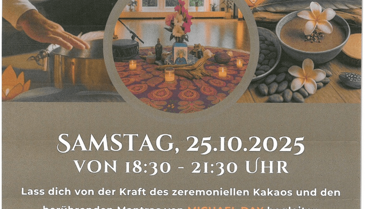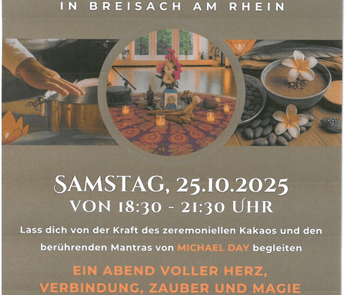 Ein Abend voller Herz, Verbindung, Zauber und Magie Lass dich von der Kraft des zeremoniellen Kakaos und den berührenden Mantras von Michael Day begleiten.