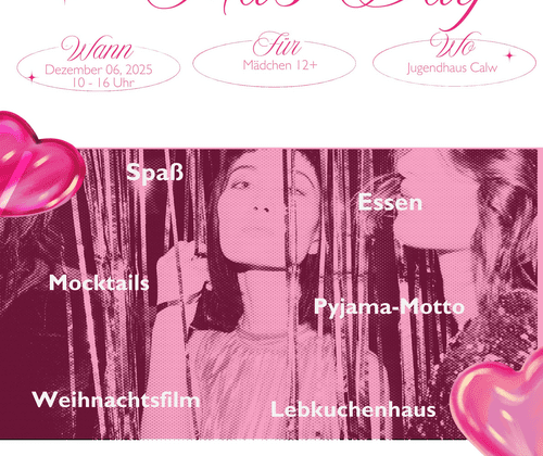 Der einmal jährlich stattfindende GIRLS DAY im Calwer Jugendhaus findet dieses Jahr in der stimmungsvollen Vorweihnachtszeit statt und richtet sich mit unterschiedlichen Angeboten, explizit an junge Frauen ab 12 Jahren. Dieses Jahr soll beim GIRLS DAY die stimmungsvolle Vorweihnachtszeit Einzug ins Calwer Jugendhaus halten und lädt alle jungen Frauen ab 12 Jahren herzlich ein. Bei dieser Pyjamaparty erwartet die Teilnehmerinnen ein gemütliches Ambiente, es werden Mocktails angeboten, Lebkuchenhäuser hergestellt und gemeinsam ein Weihnachtsfilm geschaut. Darüberhinaus wird es weitere Angebote geben, lasst euch überraschen.