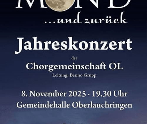 Einmal Mond und zurück lautet das Motto des Jahrekonzertes der Chorgemeinschaft Oberlauchringen unter der Leitung von Benno Grupp. Weitere Mitwirkende sind der Chor der Grundschule Oberlauchringen unter der Leitung von Frau Claudia Stockmann-Süß und der Männerchor Rechberg unter der Leitung von Martin Umrath.