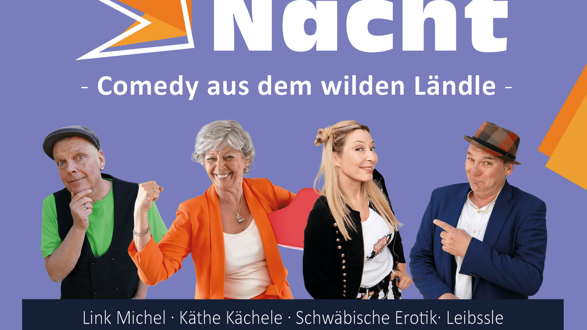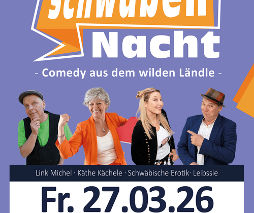 Die grandiosen Comedians Käthe Kächele, Link Michel, Leibssle und Schwäbische Erotik bringen die geballte Schwabenpower auf die Bühne. SchwabenNacht – Lachen, bis die Tränen fließen! Die große Comedy-Show mit den besten Comedians in Baden-Württemberg. Ein wahrer Pflichttermin für alle, die gerne und herzhaft lachen wollen und für beste Laune sorgt! Ein Abend voller schwäbischer Comedy, Kabarett und Musik – frech, witzig und unvergesslich. Unter dem Motto „Comedy aus dem wilden Ländle“ erwartet Sie eine Show, die einen humorvollen Angriff auf Ihre Lachmuskeln startet. Freuen Sie sich auf ein Line-up großartiger Künstler mit Käthe Kächele, Link Michel, Leibssle und der Schwäbische Erotik. Jede ihrer Shows ist ein Unikat, gespickt mit charmantem Humor und überraschenden Highlights – ein Abend, der den Lachpegel nach oben treibt! Ein Muss für alle, die Spaß und Unterhaltung lieben. Die SchwabenNacht – der perfekte Mix aus Comedy und guter Laune!