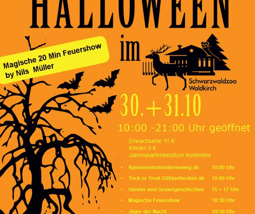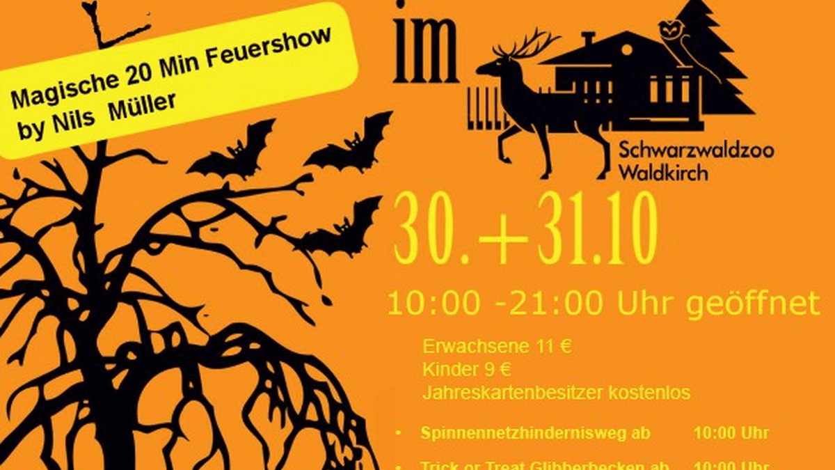 Schaurigschön dekorierter und beleuchteter Zoo mit gruseligem magischem Programm Ab 10 Uhr Trick or Treat Glibberbecken und Spinnennetzhindernisweg, 15 und 17 Uhr Geister und Gruselgeschichten; 18:30 Uhr magische Feuershow mit Nils Müller; 19:30 Uhr Jäger der Nacht Nur am 31.10.25 ab ca 18 Uhr Liveakteure von den Narrenzünften Totenberghexen und Kohlenbacher Hexen Glitzertattoos von 15 bis 19:30 Uhr in der Zooschule Schaurigschön dekorierter und beleuchteter Zoo Für das leibliche Wohl ist mit heimischen Spezialitäten gesorgt. Bratwurst (Schwein/Rind), Pommes,Hähnchenuggets, Grillbraten, Krautschupfnudeln, Winzerweckle (auch vegetarisch). Extra Kaffee und Kuchenstand mit selbstgebackenen Kuchen Es gibt leckere selbstgemachte Waffeln im Waffelhaus Halloweenrallye mit Gewinnspiel Bitte die Großparkplätze Stadtrain 2 und Erwin-Sick-Str. benutzen