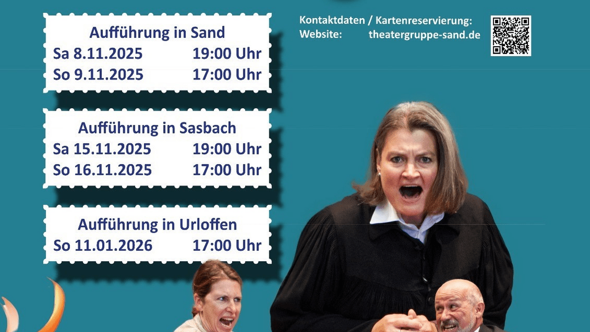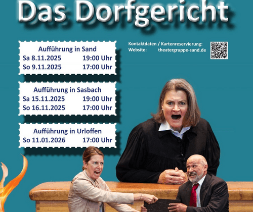 Der Verkehrsverein Sasbach-Obersasbach e.V. hat die Theatergruppe Sand e.V. nach Obersasbach eingeladen. Mit „ Das Dorfgericht “ bringt die Theatergruppe Sand e.V. eine spannende Komödie auf die Bühne – oder besser gesagt in die Grindehalle Obersasbach. Eine abgebrannte Scheune, ein Angeklagter, der es trotz erdrückender Beweislage nicht gewesen sein will - eigentlich ein Routine-Fall für Richterin Saal-Esch, die es wegen eines Experiments des Justizministeriums nach Wintersheim, dem Ort des Verbrechens, verschlagen hat. Schon nach kurzer Zeit muss sie feststellen, dass es die Dorfbewohner faustdick hinter den Ohren haben. Ob es die umtriebige Wirtshausbedienung ist, der geschädigte Bauer oder ein zwielichtiger Versicherungsagent: Jeder trägt ein Geheimnis mit sich und doch kommt es am Ende ganz anders, als es sich die Wintersheimer gedacht haben... Die Zwetschgenbacher Narrengilde e.V. sorgt mit Fingerfood und Getränken für das leibliche Wohl.
