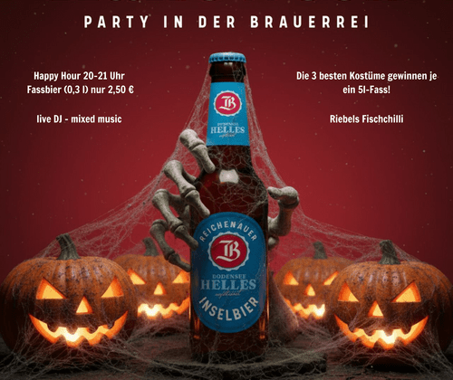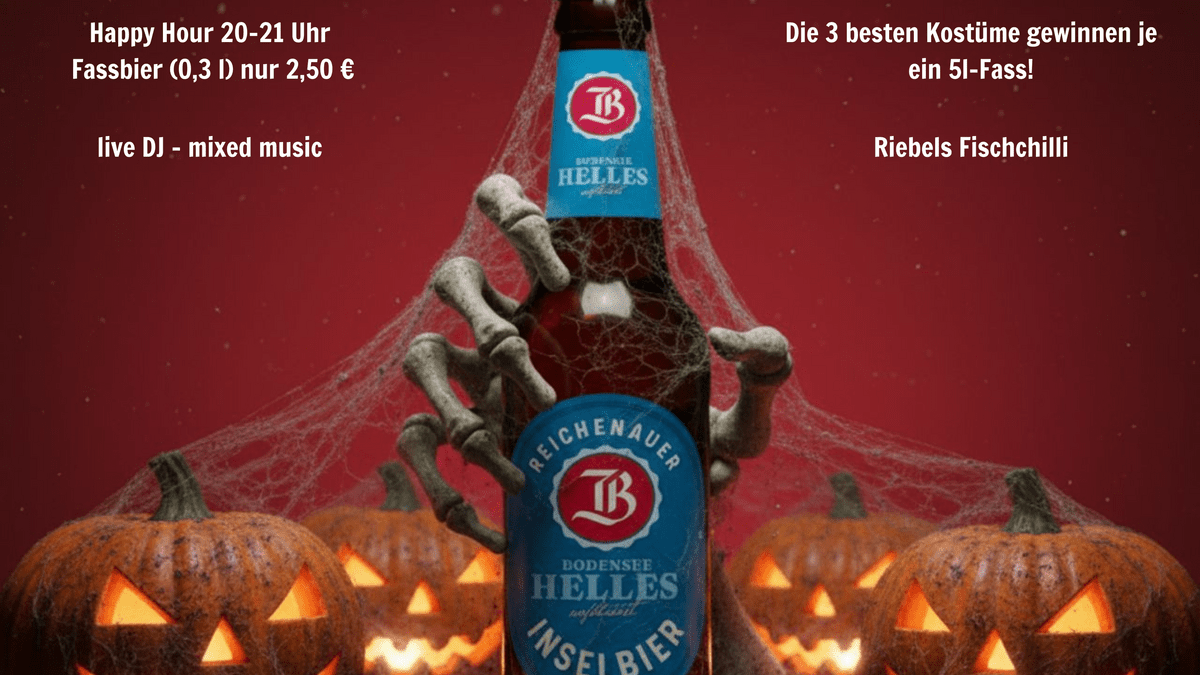 Halloween auf der Insel Am 31. Oktober wird’s schaurig schön – von 18 bis 01 Uhr laden wir alle Hexen, Vampire und Nachtschwärmer zur großen Grusel-Party ein! Happy Hour von 20 - 21 Uhr – hier spukt der beste Preis! Also kommt früh, bevor die Gläser klappern und der Nebel dichter wird. Unser Live-DJ mixt euch den perfekten Soundtrack zwischen Höllenfeuer und Tanzfläche – von spooky Beats bis Monster-Hits. Kostümwettbewerb zur Geisterstunde – die 3 gruseligsten, kreativsten oder verrücktesten Verkleidungen werden prämiert! Zeigt, was in euch steckt (oder wer) Und keine Sorge: wir lassen euch nicht verhungern – es gibt natürlich was Warmes aus dem Kessel! Also: Schnappt euch eure dunkle Seite, packt eure Freunde ein und feiert mit uns, bis der letzte Kürbis glüht!