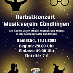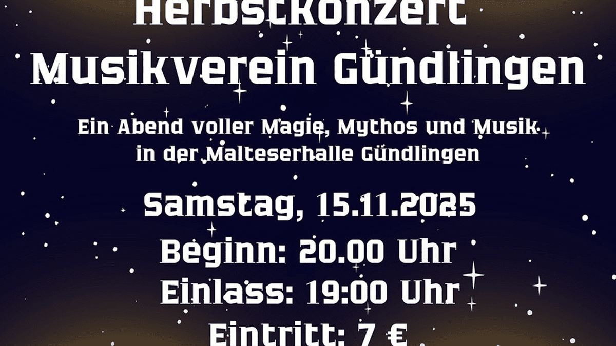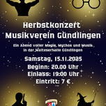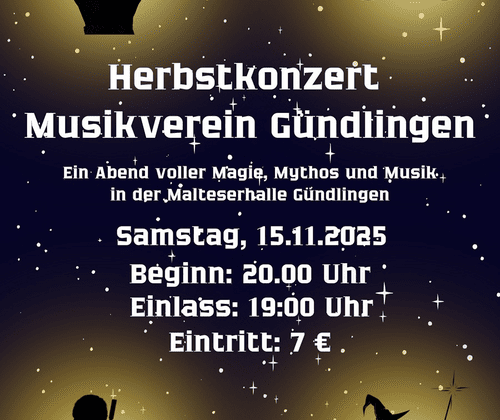 Der Musikverein Gündlingen lädt ein zum Herbstkonzert! Ein Abend voller Magie, Mythos und Musik in der Malteserhalle Gündlingen Samstag, 15.11.2025 Beginn: 20:00 Uhr Einlass: 19:00 Uhr Eintritt: 7€