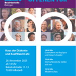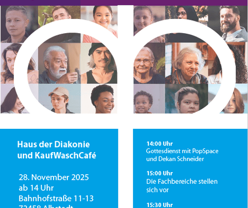 Am 28. November 2025 um 14:00 Uhr laden wir herzlich zum 80-jährigen Jubiläum der Diakonischen Bezirksstelle Balingen ein. Anlass ist ein Tag der offenen Tür im Haus der Diakonie / Kaufhauscafé in Albstadt-Ebingen. Der Festakt beginnt mit einem kurzen Gottesdienst (Leitung: Dekan Schneider, Musik: Popspace). Es folgen Darstellungen unserer Fachbereiche: Lebens- und Sozialberatung, Schuldnerberatung, Suchtberatung, Schwangeren- und Schwangerschaftskonfliktberatung, Migrationsberatung sowie Mitarbeitende aus der Landeserstaufnahmestelle Sigmaringen. Im Anschluss gibt es eine Modeschau mit Models aus Kirche, Stadt, Landkreis, Zollernalbkreis und Mitarbeitenden, präsentiert von Dekan Schneider, Oberbürgermeister Tralmer, Sozialdezernent Link und weiteren Gästen.