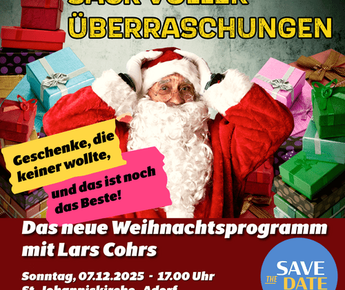 Wer kennt sie nicht, die kleinen Missgeschicke und kuriosen Momente, die uns an Weihnachten immer wieder überraschen? Lars Cohrs nimmt sich in seinem neuen Programm "EIN DICKER HUND! Von Pleiten, Pech und Tannen" genau dieser Situationen an. Wie damit umgehen, wenn die Weihnachtsgans im Backofen verkohlt, das Weihnachtsgeschenk des Partners doch nicht hält, was es verspricht oder der Lieblingsonkel plötzlich beginnt, auf der Ukulele nonstop isländische Weihnachtslieder zu interpretieren? Ruhe bewahren! Lars Cohrs weiß, wie man mit solchen Situationen umgeht und dabei den Humor nicht verliert. Der ehemalige hr3-Moderator bietet ein Füllhorn wahrlich doller Geschichten und kreative Lösungen für alle Weihnachtskatastrophen. Freuen Sie sich auf einen frühen Adventsabend voller Spaß und guter Laune mit Lars Cohrs.