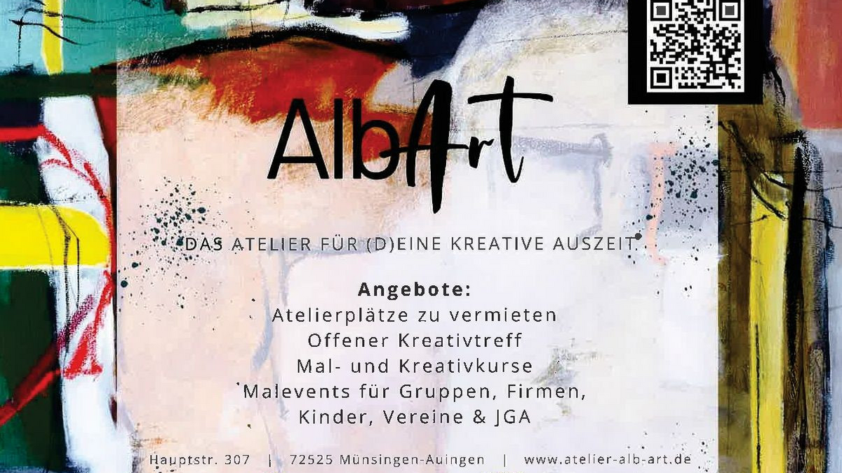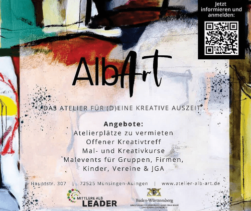 Suchst du einen festen Platz, um zu malen oder kreativ zu sein? Einen Ort, an dem alles bereitsteht und du sofort loslegen kannst? Möchtest du dem hektischen Alltag entfliehen und deine kreative Seite ausleben? Das Alb-Art Atelier ist der perfekte Ort für dich. Hier kannst du: Gleichgesinnte treffen, die deine kreative Leidenschaft teilen. In einem voll ausgestatteten Atelier direkt loslegen – ohne Vorbereitung, mit kurzen Wegen. Deine kreative Zeit flexibel nutzen, wann immer es dir passt. Dich selbst entfalten und die Kraft der Kreativität entdecken Angebote: Atelierplätze zu vermieten Offener Kreativworksthop Mal- und Kreativkurse Malevents für Gruppen, Firmen, Kinder, Vereine & JGA