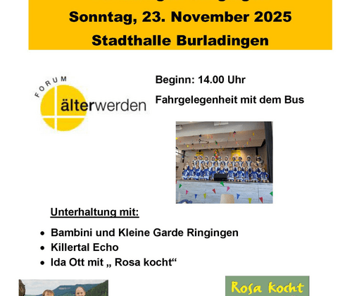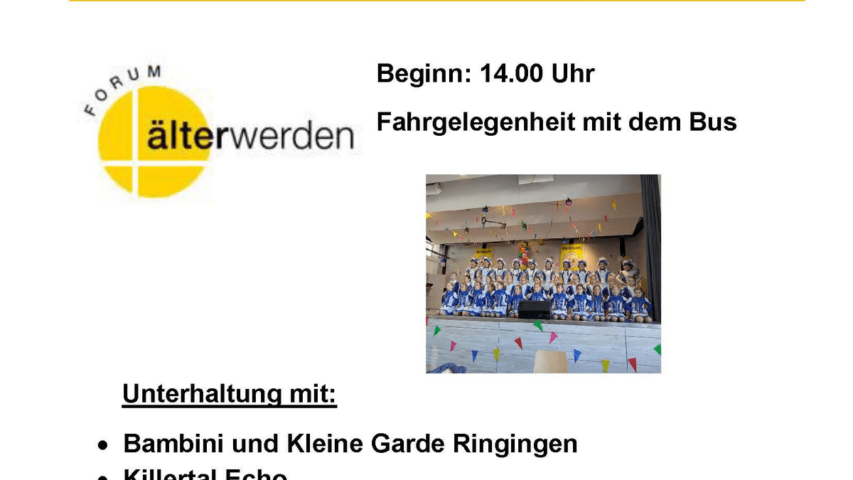 Seniorennachmittag Unterhaltung mit: • Bambini und Kleine Garde Ringingen • Killertal Echo • Ida Ott mit „ Rosa kocht" Fahrgelegenheit mit dem Bus.