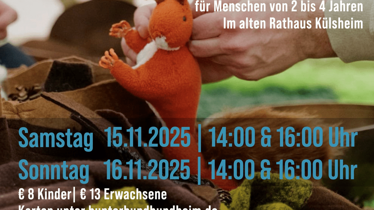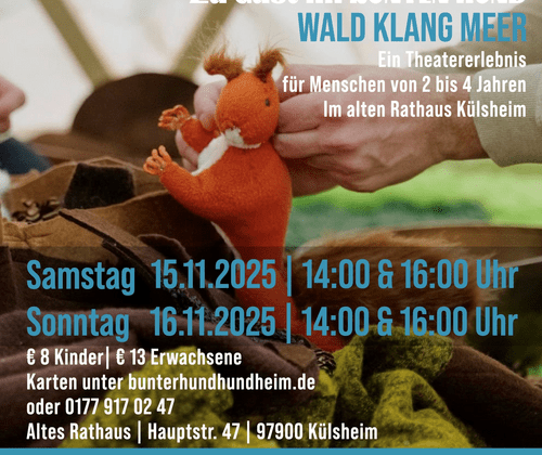 Figuren-Natur-Theater für Kinder von 2 bis 4 Jahren. Wald Klang Meer ist ein interaktives Theatererlebnis, das Kinder und Erwachsene auf einepoetische Entdeckungsreise zwischen Wald und Meer mitnimmt. Figuren-Natur-Theater für Kinder von 2 bis 4 Jahren Eine Koproduktion von theaterneuland & Theater 3D (DE), in Kooperation mit Emilien TrucheFigurenspiel (FR) Wald Klang Meer ist ein interaktives Theatererlebnis, das Kinder und Erwachsene auf einepoetische Entdeckungsreise zwischen Wald und Meer mitnimmt. In einem begehbaren Kuppelzelt werden Klänge, Bewegungen und Materialien zu einer sinnlichen Landschaft, in der Kinder aktiv mitgestalten dürfen. Haptische und akustische Erlebnisse laden dazu ein, Geheimnisse der Natur zu erforschen: das Rauschen des Meeres, das Wachsen der Pflanzen, das Rascheln der Blätter. Die Grenzen zwischen Bühne und Zuschauerraum lösen sich auf – Theater wird zum gemeinsamen Erfahrungsraum. Team: Spiel: Ronja Schweikert, Emilien Truche, Stefan Ehlen Konzept: Ronja Schweikert, Beate Krist Figurenbau & Ausstattung: Emilien Truche, Susann Tonne, Ronja Schweikert Musik: Stefan Ehlen Regie: Ulrike-Kirsten Hanne Fotos: Dominique Brewing Trailer: www.theaterneuland.de/neuland-projekt-wald-klang-meer/ Hinweis: Die Aufführung ist nicht barrierefrei; gemeinsam sitzen wir auf dem Waldbodenteppich. Gefördert durch: Fonds Darstellender Künste / Neustart Kultur Stadt Wiesbaden Bunter Hund e.V. NABU Stadt Külsheim Ritter Sport Baumschule Münkel