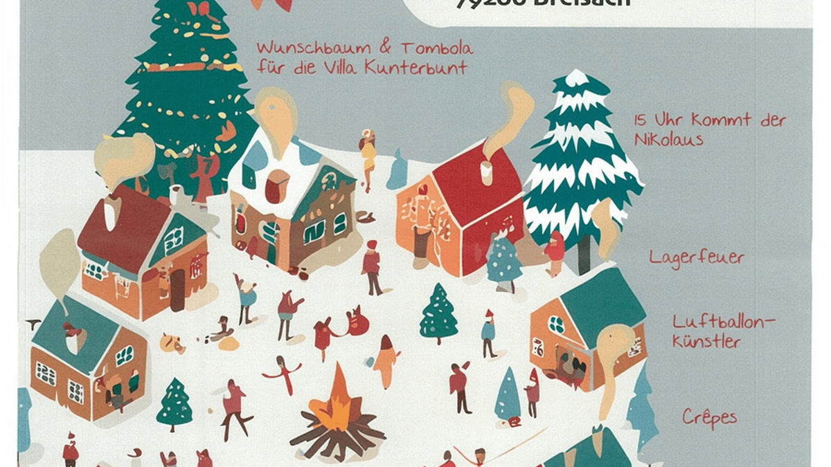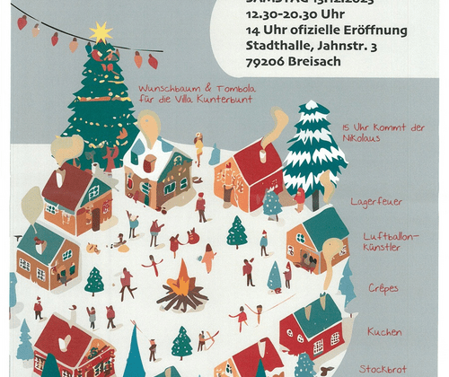 Weihnachtliches Dorf mit Programm für Groß und Klein in der Stadthalle in Breisach. Samstag 13.12.2025, 12:30 Uhr - 20:30 Uhr Programm: - Besuch vom Nikolaus (15 Uhr): Kleine Überraschungen für Kinder - Lagerfeuer : Gemütliches Beisammensein am wärmenden Feuer - Spaß und Unterhaltung - Essen & Trinken : Kaffee, Kuchen, Crêpes,Stockbrot, Glühwein, Kinderpunsch uvm. Bitte bringt eigenen Tassen mit! - Wunschbaum & Tombola für die Villa Kunterbunt