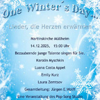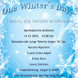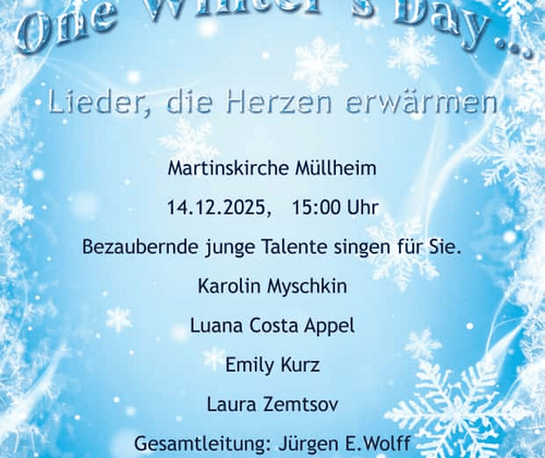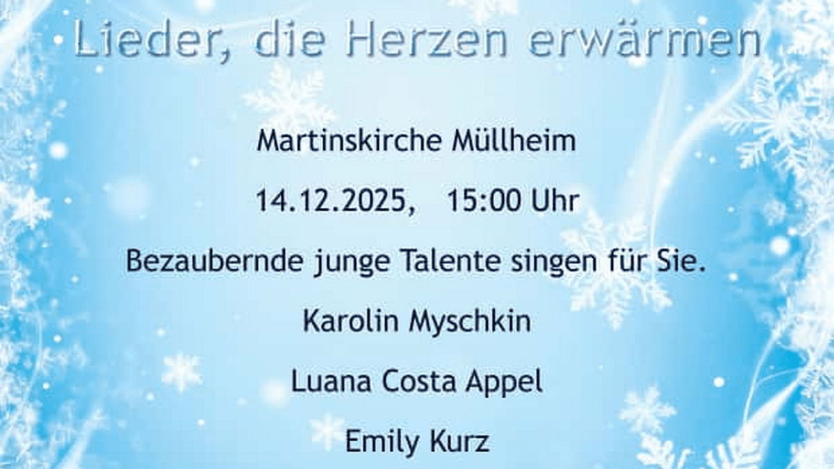 Winterkonzert "Lieder, die Herzen erwärmen" Bezaubernde junge Talente singen für Sie: Karolin Myschkin, Luana Costa Appel, Laura Zemtsov Gesamtleitung: Jürgen E. Wolff Eine Veranstaltung des Pop-Song-Studio Eintritt frei, Spenden erbeten