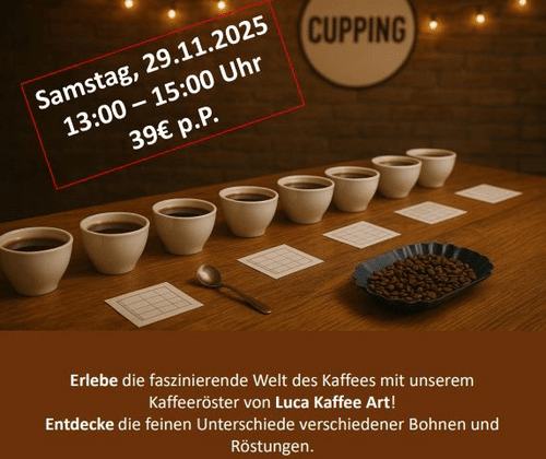 Erlebe die faszinirende Welt des Kaffees mit unserem Kaffeeröster von Luca Kaffee Art! Entdecke die feinen Unterschiede verschiedener Bohnen und Röstungen. Genieße unser Event rund um die Kunst des Kaffeeverkostens inklusive einem passenden Stück Kuchen!