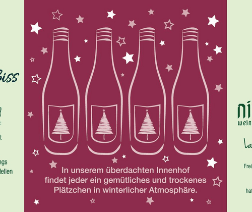 Feiert mit uns im historischen Innenhof des Weinguts und genießt die Winterzeit mit unserem Winzerglühwein. In unserem überdachten Innenhof findet jeder ein gemütliches und trockenes Plätzchen in winterlicher Atmosphäre. Es gibt Niwenburg Weine und unseren eigenen Winzerglühwein. Auch für das leibliche Wohl ist gesorgt. Es gibt von "Zülfis Imbiss" Grillwurst & Currywurst in allen Varianten, Pommes mit verschiedenen Toppings, Vegetarische Gemüsefrikadellen, Gulaschsuppe, Waffeln und vieles mehr.