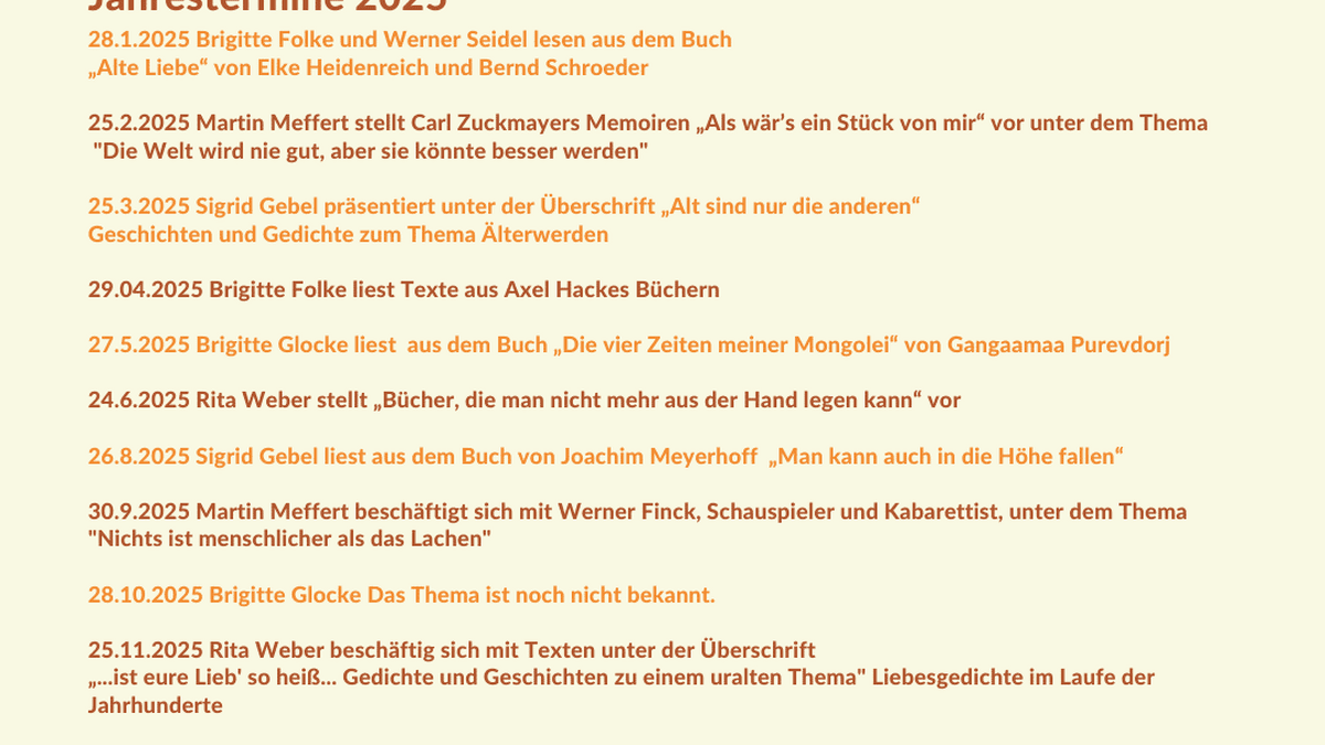 Engagierte Vorlesepatinnen und - paten der Stadtbücherei vertiefen sich ein eine Thema oder in die Lebensgeschichten bekannter Persönlichkeiten und bereiten die Texte zum Vorlesen vor. In der gemütlichen Runde lesen sie die Texte vor. In einer Pause serviert der Förderverein der Stadtbücherei Lauterbach e.V. warme Getränke und Gebäck. Der Eintritt ist frei, um eine Spende wird gebeten.