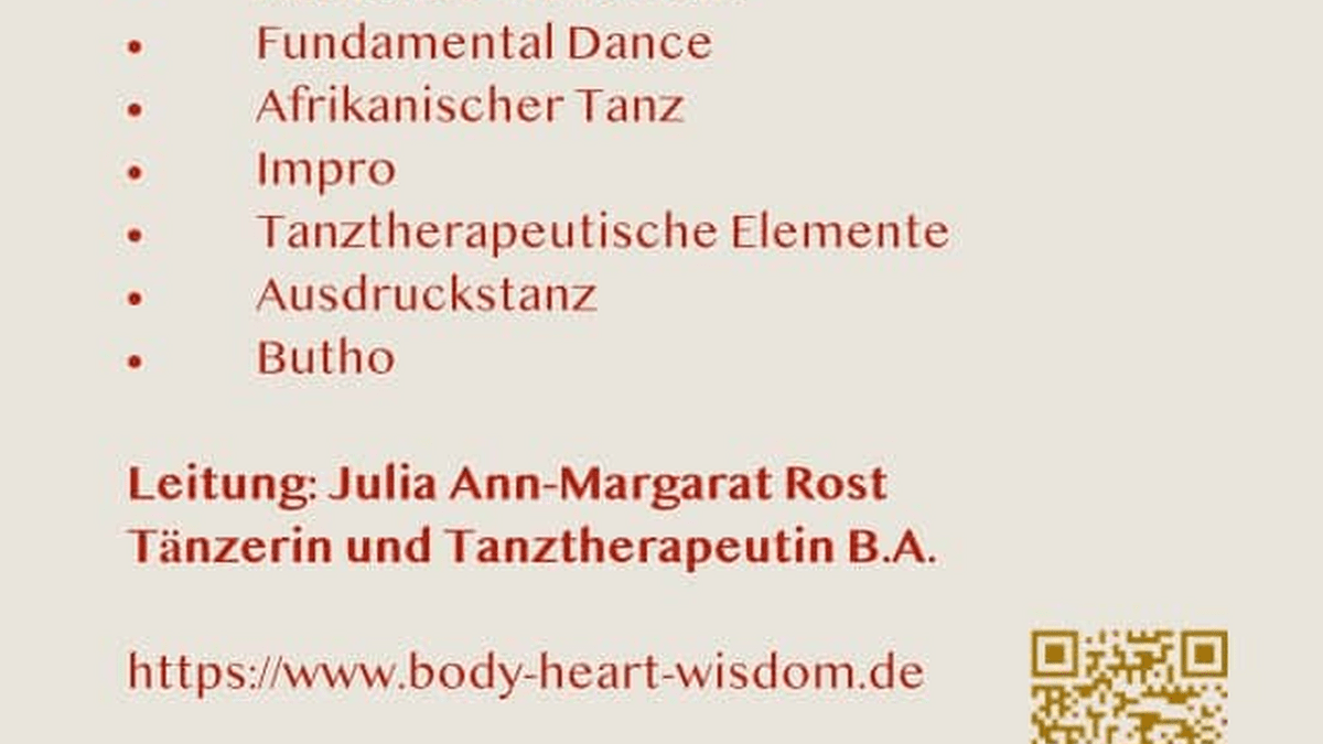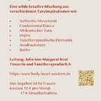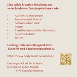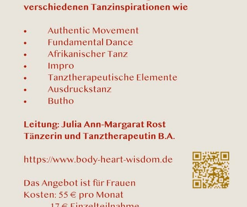 Kurzbeschreibung: Eine kreative Mischung aus verschiedenen Tanzinspirationen wie Authentic Movement, Fundamental Dance, Afrikanischer Tanz, Impro, Tanztherapie, Ausdruckstanz, Buhto