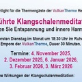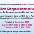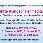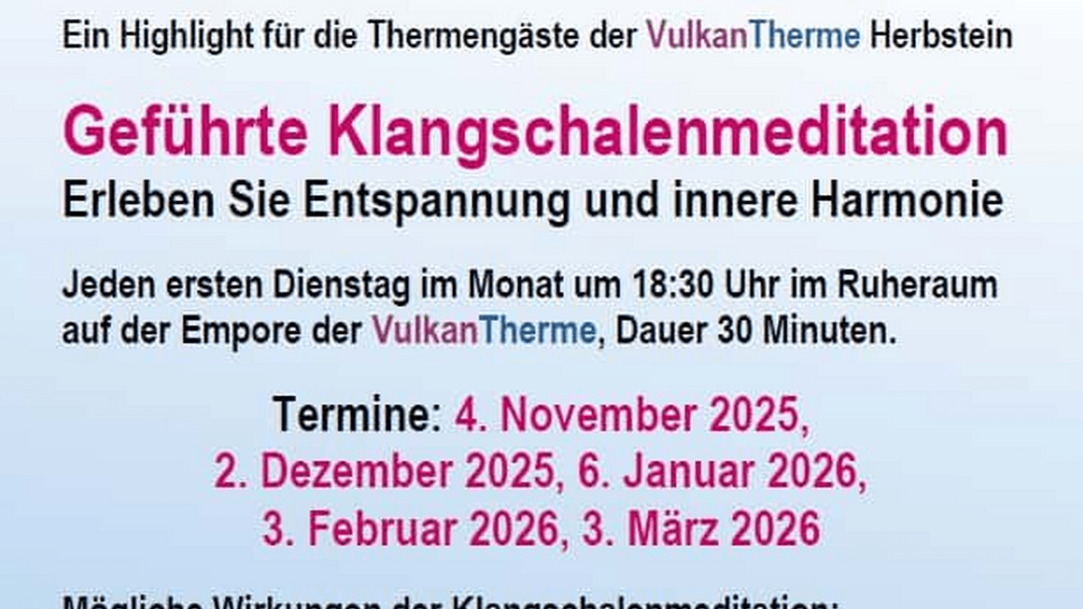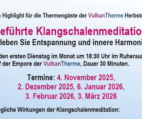 Ein Highlight für die Thermengäste der VulkanTherme Herbstein Geführte Klangschalenmeditation Erleben Sie Entspannung und innere Harmonie Jeden ersten Dienstag im Monat um 18:30 Uhr im Ruheraum auf der Empore der VulkanTherme, Dauer 30 Minuten. Termine: 4. November 2025, 2. Dezember 2025, 6. Januar 2026, 3. Februar 2026, 3. März 2026 Mögliche Wirkungen der Klangschalenmeditation: Stressabbau und Entspannung Förderung der Konzentration Verbesserung des Schlafs Stärkung des Immunsystems Emotionale Balance Wir freuen uns auf Ihre Teilnahme – freuen Sie sich darauf, die wohltuende Wirkung der Klangschalen zu erleben. Anmeldung und weitere Informationen: Bitte melden Sie sich im Voraus an der Kasse in der VulkanTherme an, da die Teilnehmerzahl begrenzt ist. Da das Angebot in der VulkanTherme stattfindet, ist die Teilnahme gegen einen kleinen Kostenbeitrag ausschließlich für Gäste mit Eintrittskarte für die VulkanTherme oder VulkanSauna möglich.