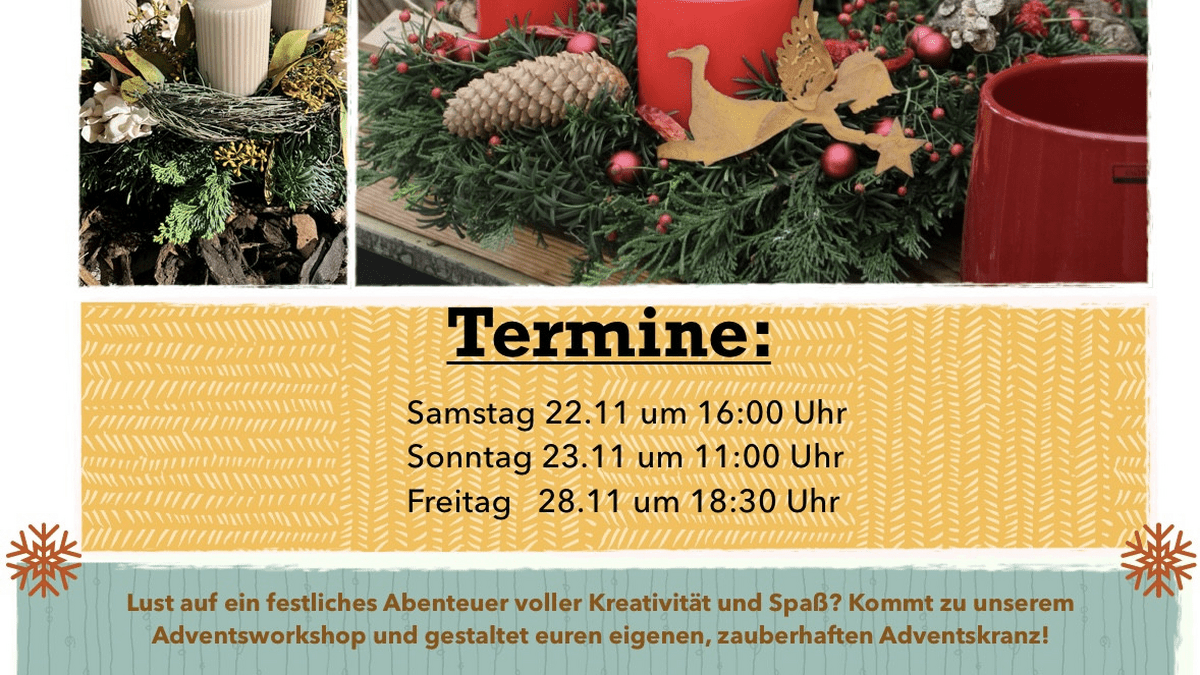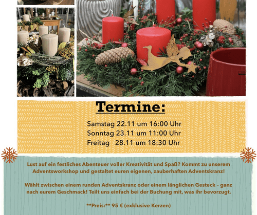 Adventsworkshop der Gärtnerei Denz Samstag 22.11. 16:00 Uhr Sonntag 23.11. 11:00 Uhr Freitag 28.11. 18:30 Lust auf ein festliches Abenteuer voller Kreativität und Spaß ? Kommt zu unserem Adventsworkshop und gestaltet euren eigenen, zauberhaften Adventskranz ! Wählt zwischen einem runden Adventskranz oder einem länglichen Gesteck- ganz nach eurem Geschmack. Teilt uns bei der Buchung mit, was ihr bevorzugt. Preis 95,00 Euro (exklusive Kerzen) Und das Beste ? Im Preis sind Glühwein, Punsch sowie alkoholfreie Getränke und eine Auswahl an leckeren weihnachtlichen Gebäcken enthalten. Wir verwenden tolles, frisches Grün, dass in Steckmasse gesteckt wird, damit euer Kranz besonders lange hält und in vollem Glanz erstrahlt. Lasst uns gemeinsam in Weihnachtsstimmung kommen und die Vorfreude auf das Fest genießen ! Meldet euch schnell an und sichert euch euren Platz - wir freuen uns auf euch.