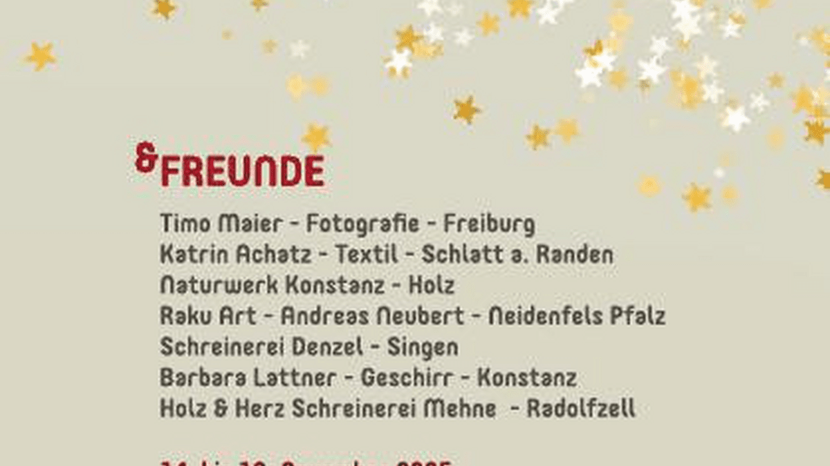 Lichterzauber 25 Schönes und Außergewöhnliches 14.-16.11.2025 Fr. 17.00-21.00 Uhr Sa. u. So. 14.00-20.00 Uhr mit Glühwein und Bratwurst Hallihallo! Zum dritten Mal in der alten Schreinerei eröffnen wir mit dem Lichterzauber die vorweihnachtliche Zeit - mit Kunst, Handwerk, Licht und Atmosphäre Kommt vorbei, lasst Euch inspirieren und startet mit uns in die Lichterzeit Wir freuen uns auf Euch! Alexandra & Hannah Timo Maier - Fotografie - Freiburg Katrin Achatz - Textil - Schlatt am Randen Naturwerkstatt Konstanz - Holz Raku Art-Andreas Neubert-Pfalz Schreinerei Denzel - Singen Barbara Lattner-Geschirr-Konstanz Holz & Herz Schreinerei Mehne - Radolfzell